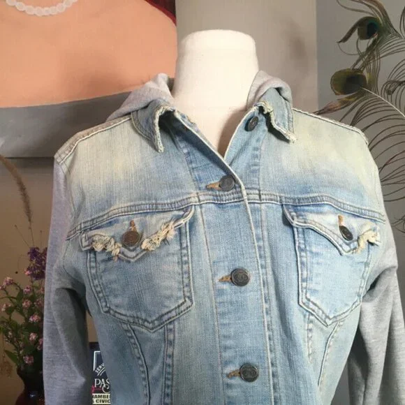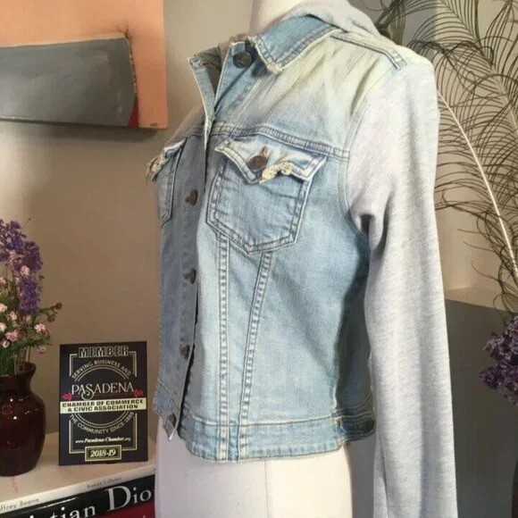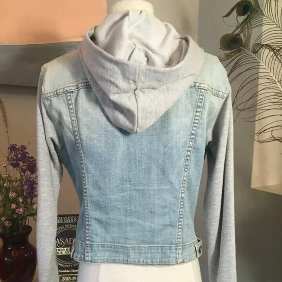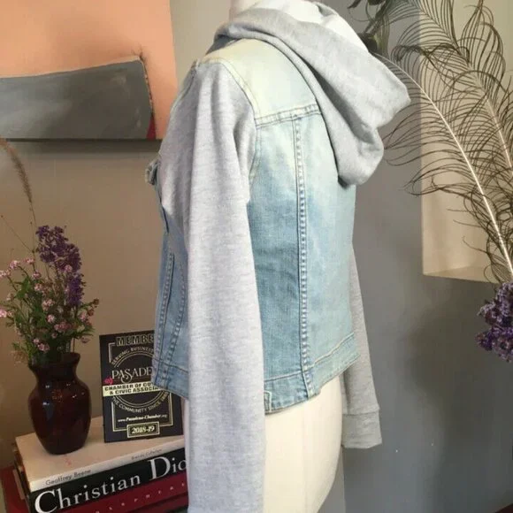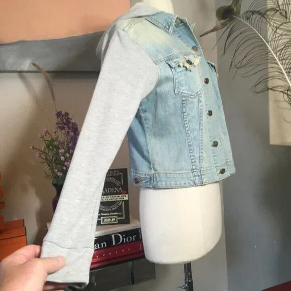 John Eshaya Size P/S Blue Denim Gray Knit Hood Jacket 2400-203-51320John Eshaya makes casual dressing easy with this urban cool distressed denim jacket with knit sleeves and hood....