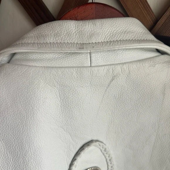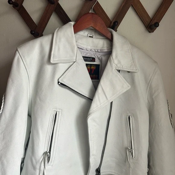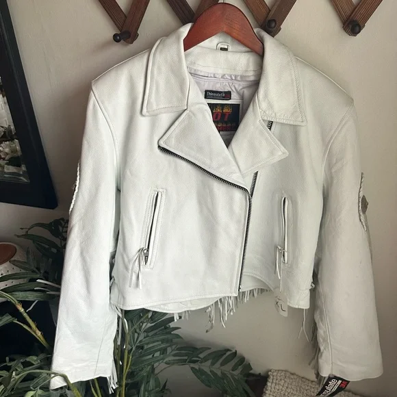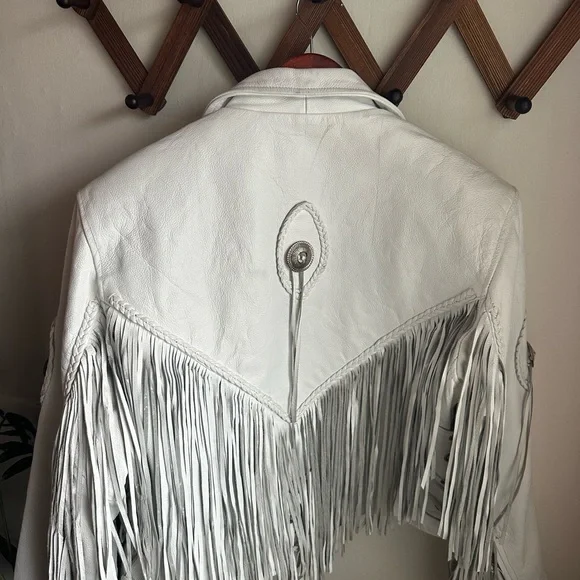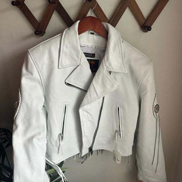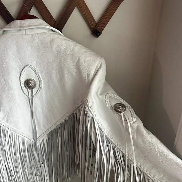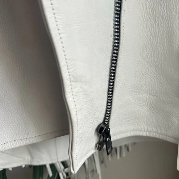 New with tags, but some wear from closet, moving, etc. see photos! Elevate your style with this chic white leather jacket featuring elegant fringe detailing. Perfect for adding a touch of sophistication to any outfit.
