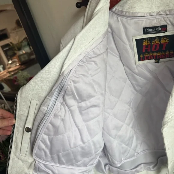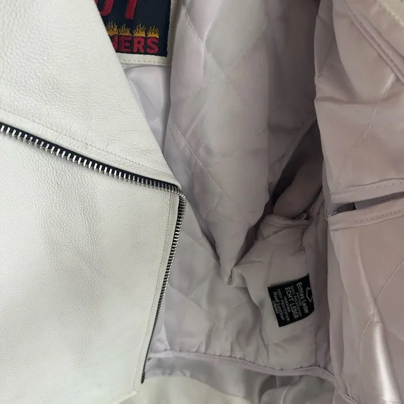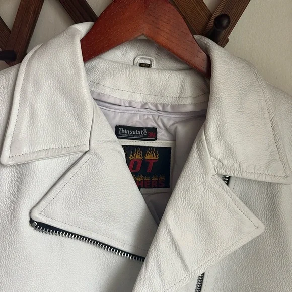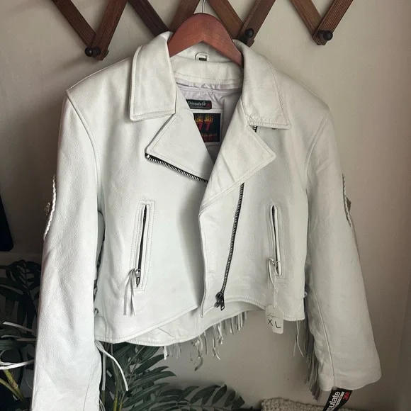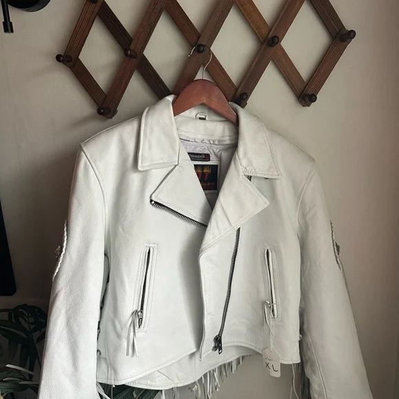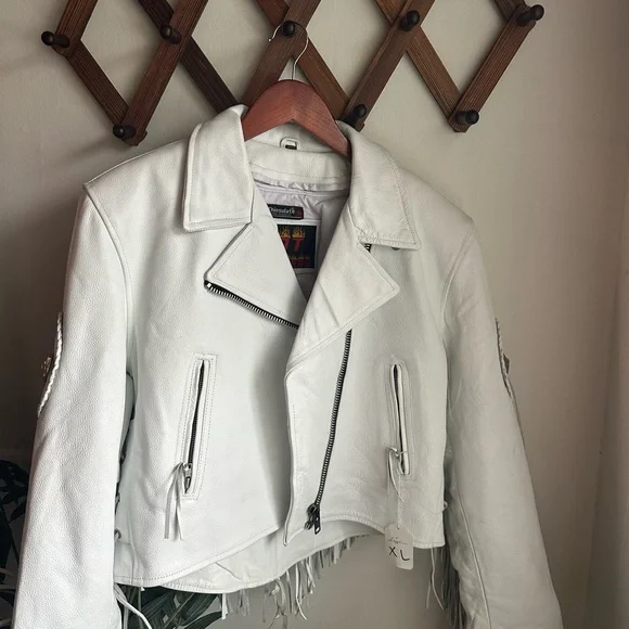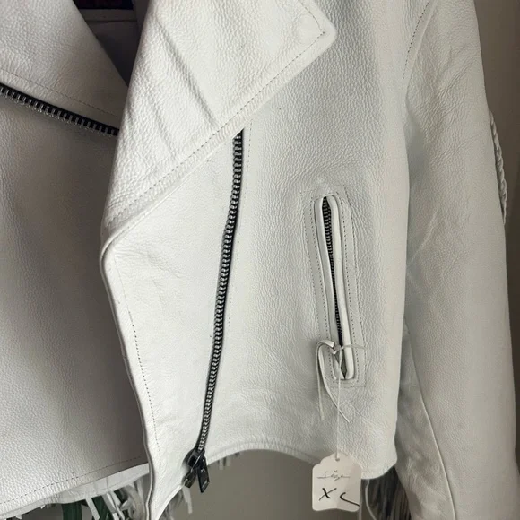New with tags, but some wear from closet, moving, etc. see photos! Elevate your style with this chic white leather jacket featuring elegant fringe detailing. Perfect for adding a...