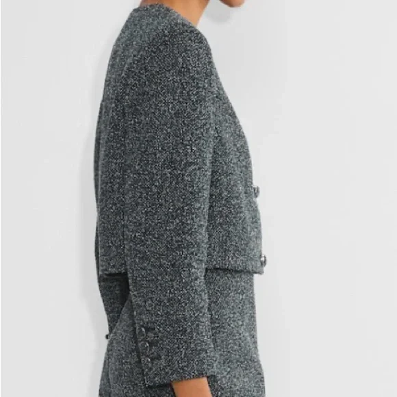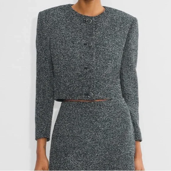 This is a button-up jacket with shoulder pads and a classic fit. It´s expertly tailored from soft, textural tweed that´s made with recycled polyester.FeaturesLinedCupro liningShoulder padsButton closure Recycled materials have a lower environmental impact than their virgin alternativesMaterials & CareContent: 55% cotton, 45% polyester; Lining: 100% cuproCare: Machine washImported Fit: Classic — An easy fit with a little roomLength: Waist — Intended to hit around the waistA size 4 will fit someone who typically wears a S in other Aritzia clothingBUST34 INWAIST26 INHIPS36 IN