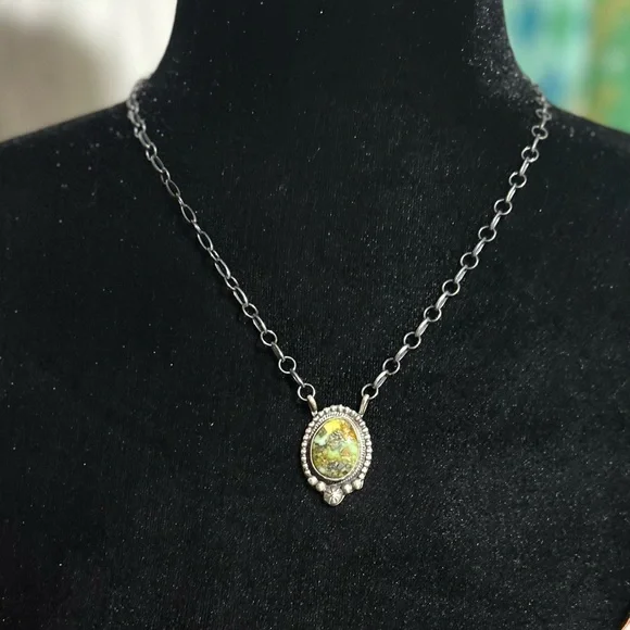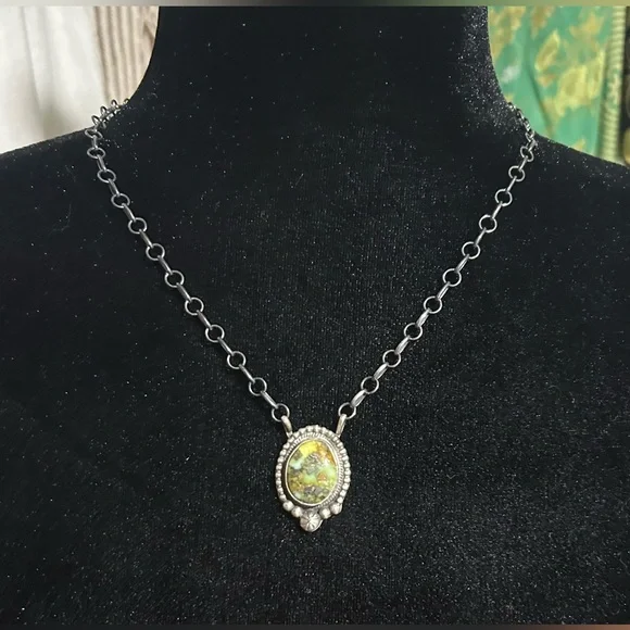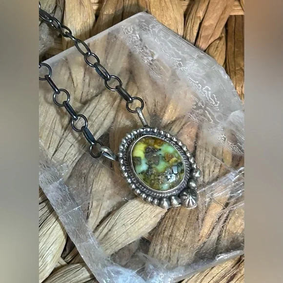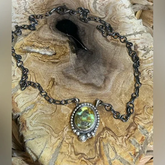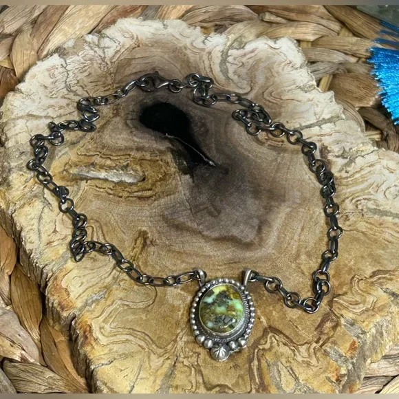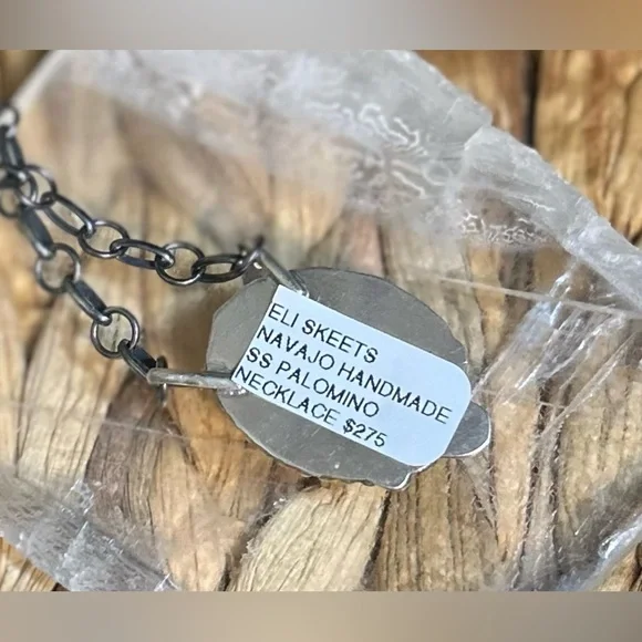 NWT Navajo Handmade Eli Skeets Necklace$295Palomino Variscite ‘Turquoise’ and Sterling SilverPalomino is a rare and distinctive variscite variety that is mined from a small...