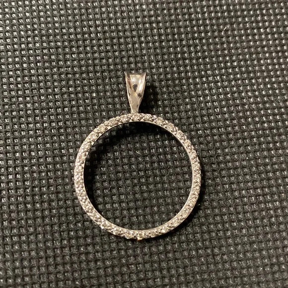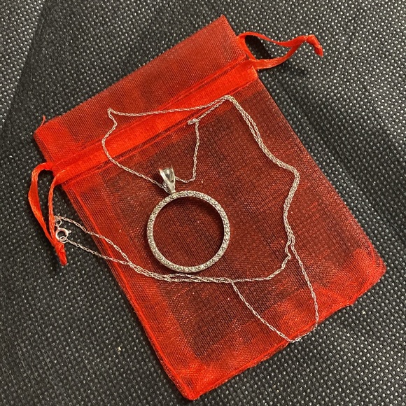 14K white gold Forever One Moissanite Prong Circle Pendant with 10K necklace & bag. Vintage 14K white gold with stones circle pendant. Gently warn and excellent condition. A diamond circle pendant symbolizes eternity, which means there is no end. Just as you cannot find the beginning and ending of the circle in a pendant, similarly love has no beginning or end. Do not know value of stones if are cubic zirconia. Chain is marked 10k. Measurements approximately 1”. Chain is estimated at 9” long. Smoke free home. Sold as is condition. Priced to sell and if not what you want to pay, please make reasonable offer. Thank you for checking my closet.