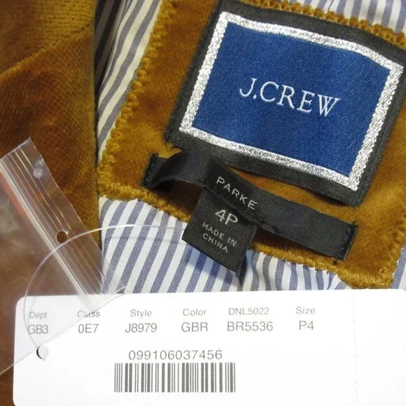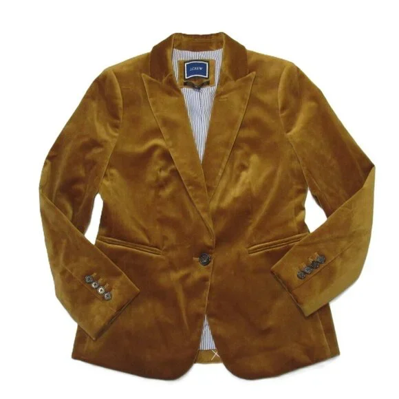 Up for purchase today is...Designer: J.CrewSize: 4PFit: Please do not go by size number but rather check measurements listed below to determine if the item will fit.Color: Golden BrandyStyle/Design #: J8979 (Ho 20)Material: 100% cotton / Undercollar 55% viscose, 45% wool / Lining 100% polyesterDetails:* She´s back! Our best-selling Parke blazer: now in four shades of luxurious velvet and with a peak lapel and the prettiest inner beauty. Long story short, we´re layering it over everything this fall. Cotton. Peak lapel with under-collar felt. Double welt pockets, interior pocket. Functional buttons at cuffs. Back vent. Lined. Dry clean. Import. *Condition: New with tags Measurements:Shoulder - 14 ½"Chest - 36 ½"Waist - 32 ½"Length - 25"Sleeve (outer) - 22"