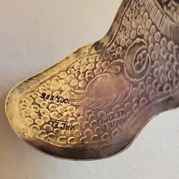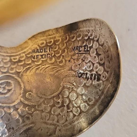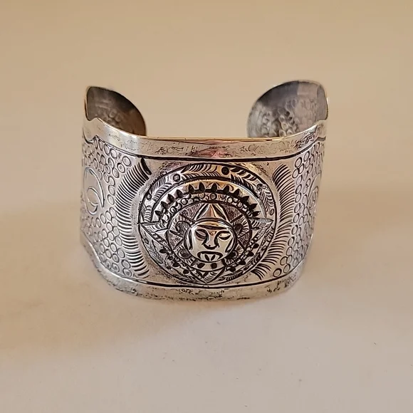Vintage Maciel signed Aztec Mayan cuff bracelet. Signed with Sterling, Maciel, Mexico. 925/1000. Each of their bracelets are hand carved and a little different with each design. Measures 1-1/2" wide. Length end to end is 6". Also can be spread out a little to adjust size.