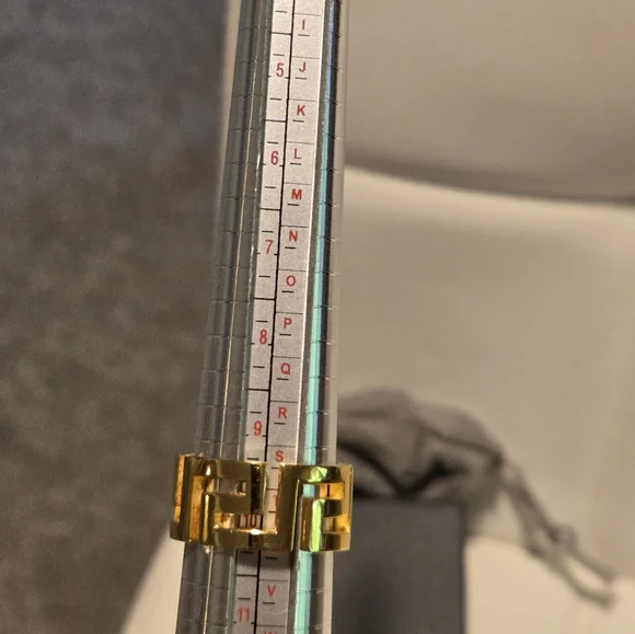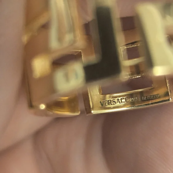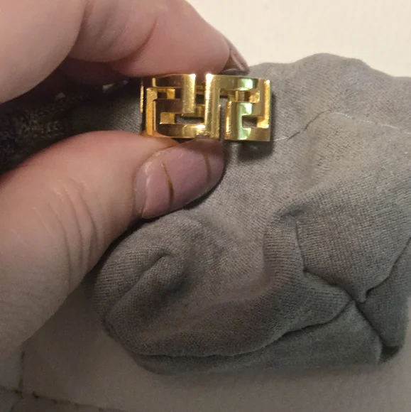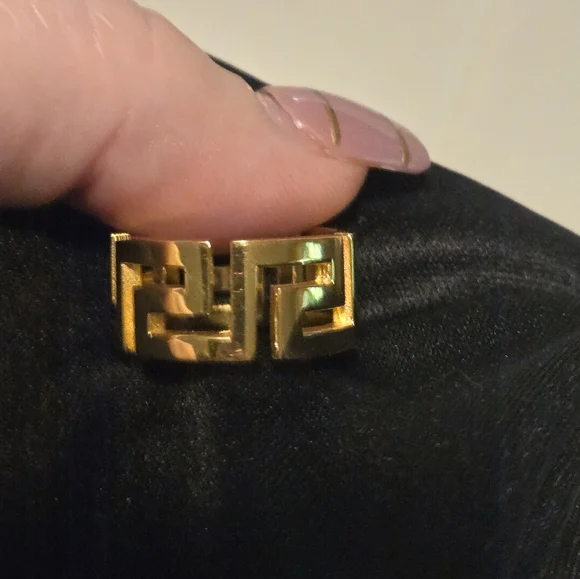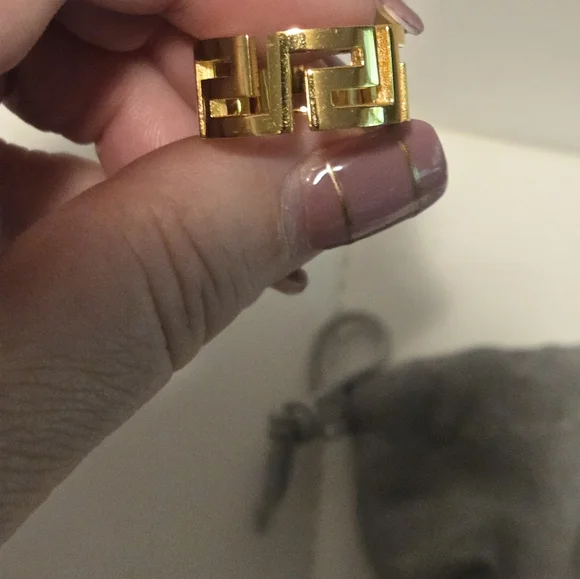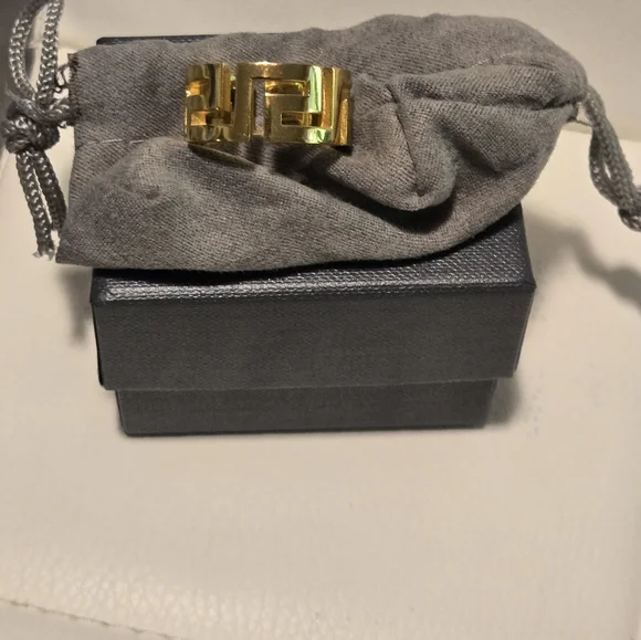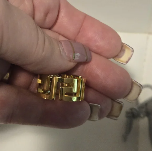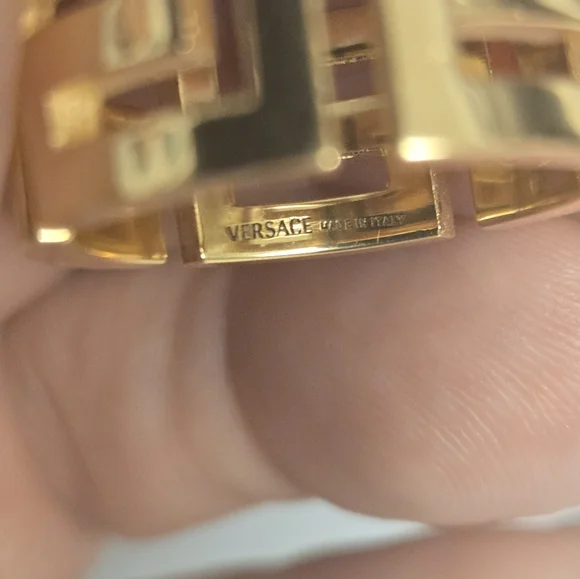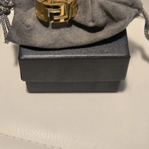 Authentic Versace gold plated ring size 9.5. Gorgeous classic Versace greek key design. Stamped Versace made in Italy. Very substantial/ wide band ring- almost 1/2 inch(approx. 7/16 in. wide) Great pre-loved condition with Minor scratching and wear. Comes in velvet pouch and nice box. Gift with purchase. Smoke and pet free home.