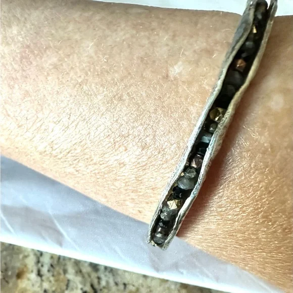 This is a beautiful Cuff Bracelet by Mashka in Sterling Silver with labraborite, Spinel & pyrite gemstones. This is on her site currently for $484. Fits Medium sized wrist & is in...