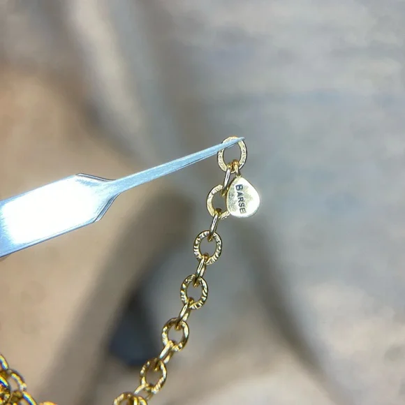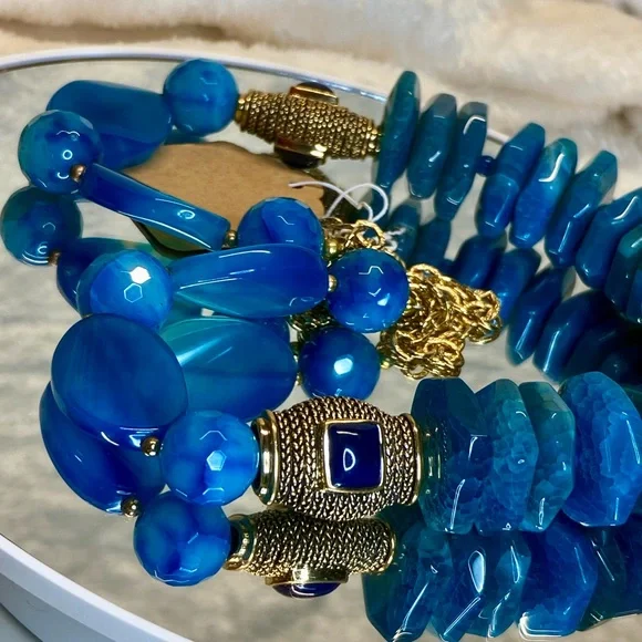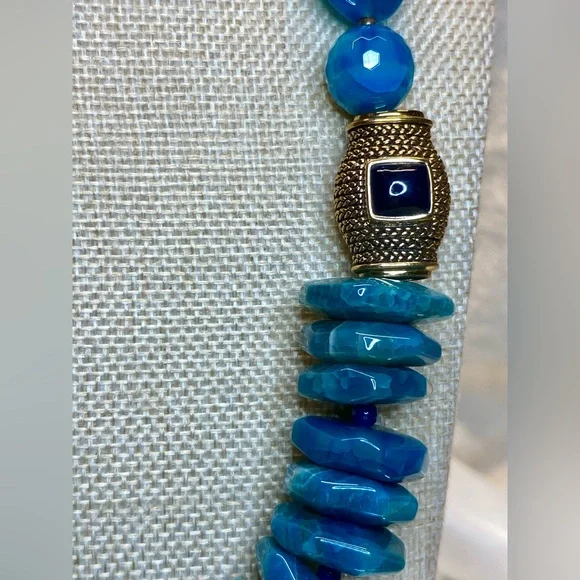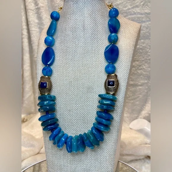 Beautiful EUC Barse Dragons Vein Beaded Necklace with Kyanite set in Gold Tone Cabochons 24” with 2” extension chain This **EUC (Excellent Used Condition) Barse Dragons Vein Beaded Necklace** is a stunning piece of jewelry that blends natural beauty with intricate craftsmanship. The necklace features **dragons vein agate beads**, known for their striking, unique veining patterns, adding a touch of mystical allure. The focal point of the design is the inclusion of **Kyanite cabochons**, which are set in **gold-tone metal**, enhancing the richness of the color and creating a luxurious contrast against the agate beads. Kyanites deep blue hue adds an elegant pop of color, making the necklace a statement piece.The necklace itself measures **24 inches in length**, with an additional **2-inch extension chain**, allowing for adjustable fit and versatility. The combination of the natural stones and gold-tone accents creates a refined yet bold aesthetic that is perfect for both casual and formal occasions.In excellent used condition, this necklace is a beautiful accessory that showcases a perfect balance of timeless style and contemporary appeal.****PLEASE VIEW ALL PHOTOS FOR CLOSEUPS AS THEY ARE PART OF THE DESCRIPTION. These are vintage preloved pieces with wear and tear appropriate for age