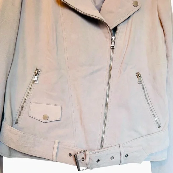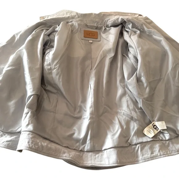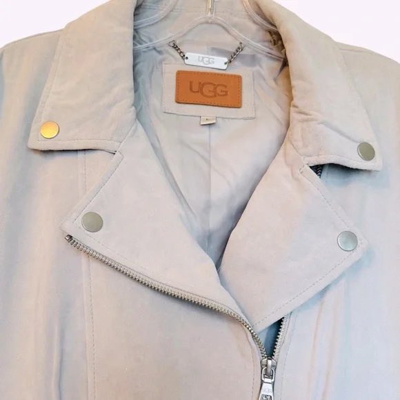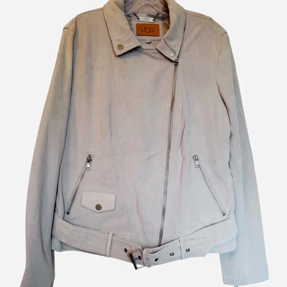 UGG Women’s STACEY Dove Grey Suede Moto Biker Jacket Size LargeNEW WITH TAGS$595 MSRP UGG Women’s STACEY Dove Grey Suede Moto Biker Jacket is a stylish and versatile outerwear piece, made of high-quality buttery suede. Classic biker design with a full zip and snap closure, long sleeves, and a collared neckline. The belt, buckle and zipper detail on pockets, add a touch of edgy sophistication to any outfit. 21” Underarm to Underarm24” Sleeve Length24” Length