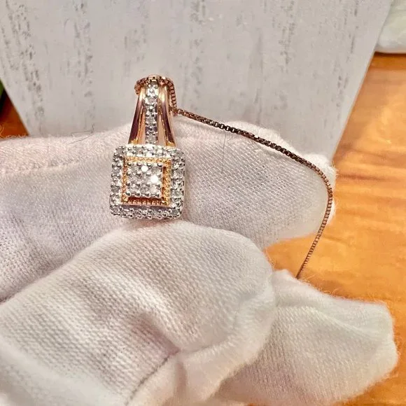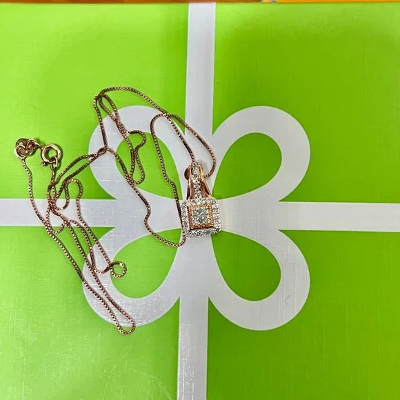 NWT no price. Estate piece never worn. ---Pendant is 14K Rose Gold over silver.1/10CTTW diamonds. Pendant is approximately 1/2 inch x 1/4 inch. Stamped 925 SUN.---Chain is approximately 18 inches.14K Rose Gold. Stamped KA 1772, 14K Italy.Comes with original box and original cloth bag. From JCP several years ago. Should be gently cleaned.Excellent condition.