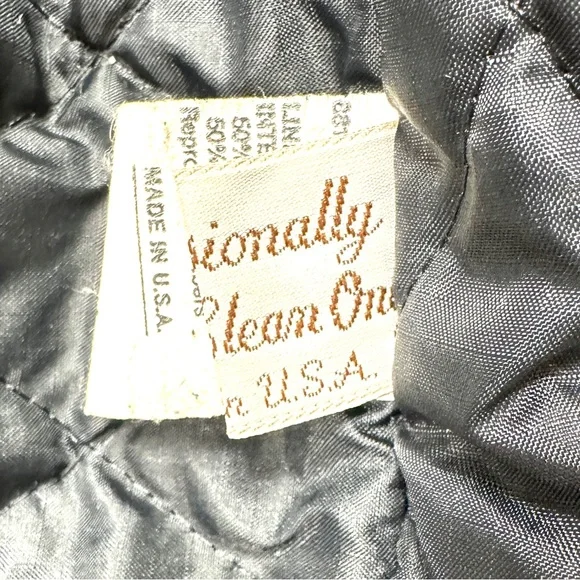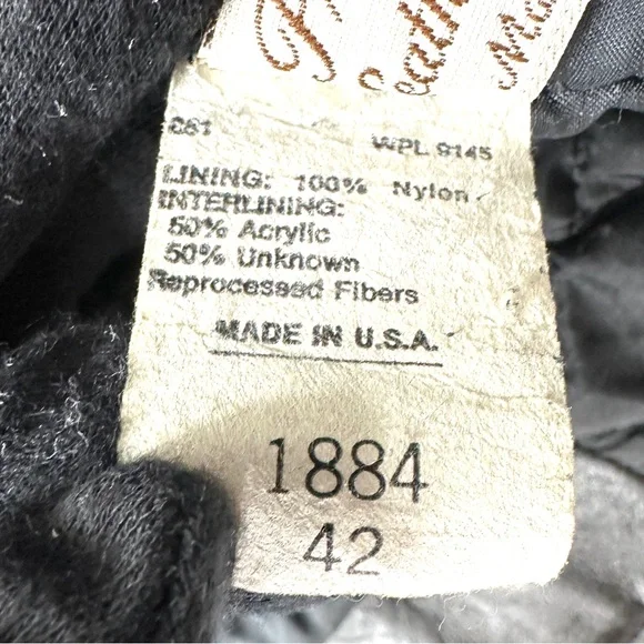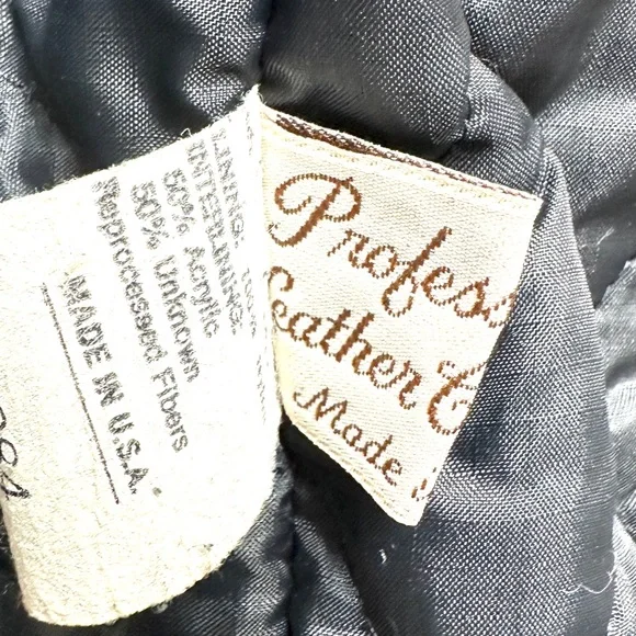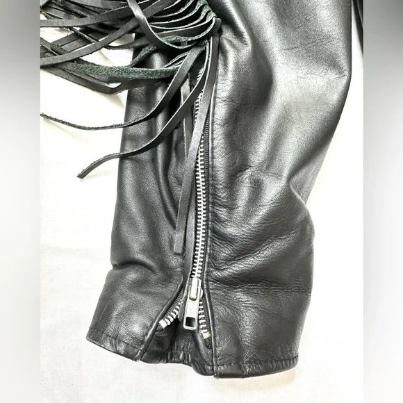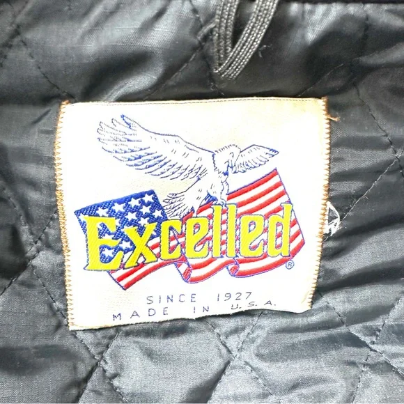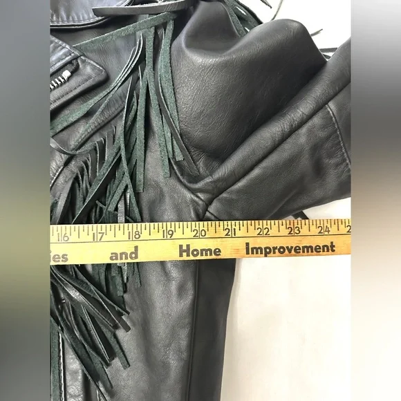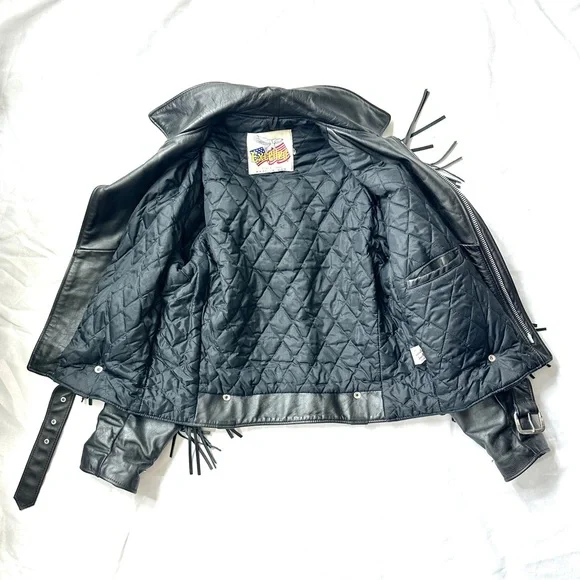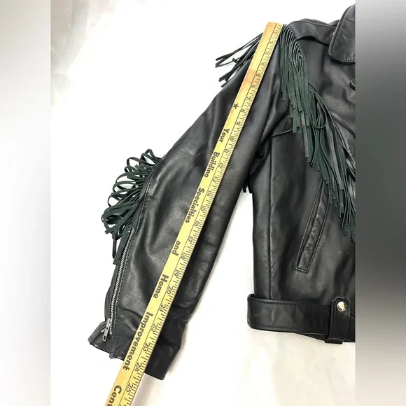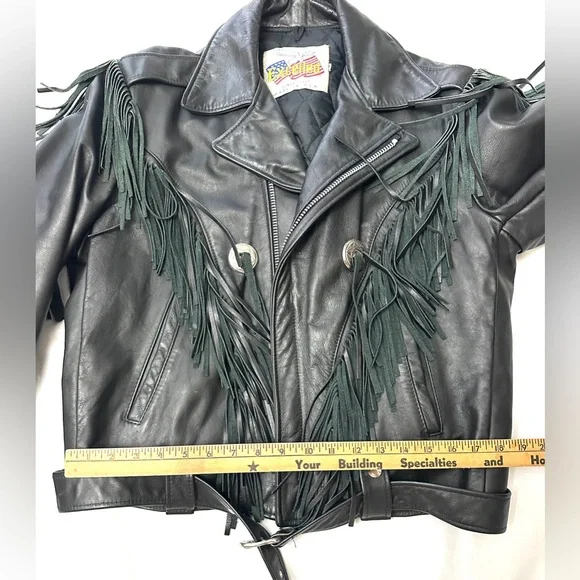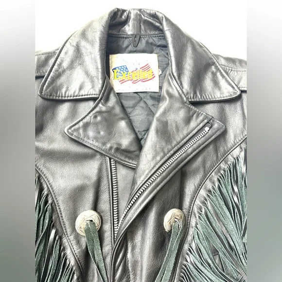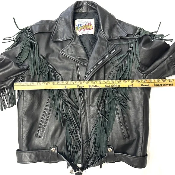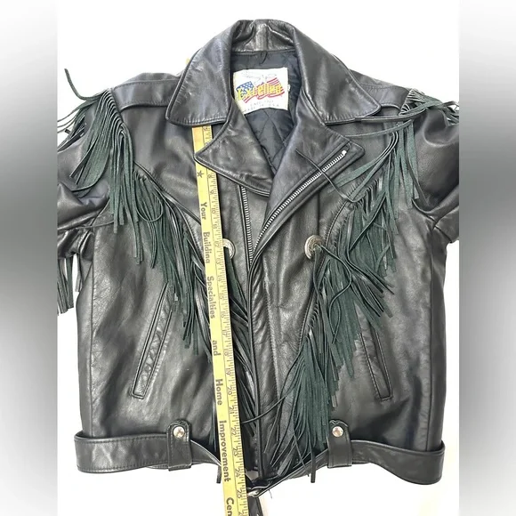 Born in the USA!!! Are you looking for a leather jacket that is as American as you are?You´ve found it! This vintage Excelled women´s size 42 (see measurements when determining if this will fit) black leather motorcycle jacketis made in the USA since 1927. It has lots of fabulous fringe and conchos on the front and back for shine and fun. Whether you´re rock n roll or western, this jacket will add to your look. This jacket zips and has a belt around the bottom. The bottom third of each sleeve also zips so it´s easy to get on and off. The front has a pocket on each side. The inside lining is quilted for a bit of warmth when needed. Very good condition. Minimal normal wear. Small size tag attached to Brand tag inside near collar has been cut off.**I’m not the manufacturer or a clothes store so don’t have and can’t provide you with fit advice.Armpit to armpit: 20" (about double for circumference).Length from shoulder to bottom: 24".Sleeve length about" 24".Around bottom: about 18"(about double for circumference).
