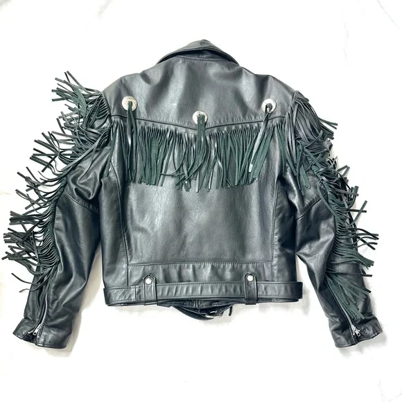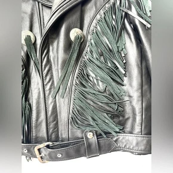 Excelled Vintage Women Size 42 Black Leather Fringe Concho Motorcycle Jacket