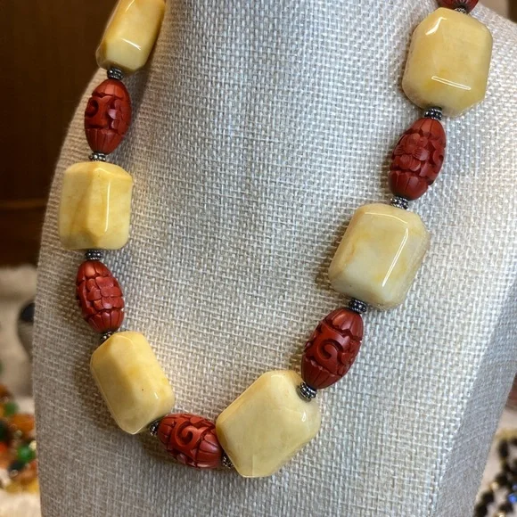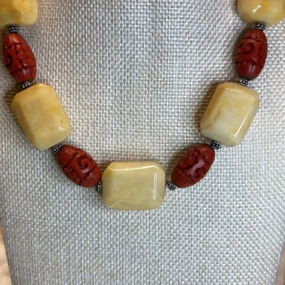 Vintage Chinese Jade and Cinnabar on Sterling Silver 16” Necklace.EUC1”X3/4” blocks of Yellow Jade 1/2 inch thick and 1” cinnabar beads.Necklace is 16” long on Sterling...