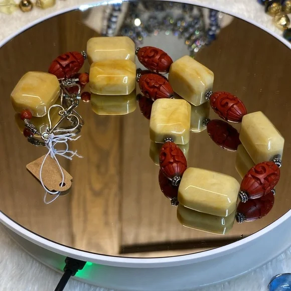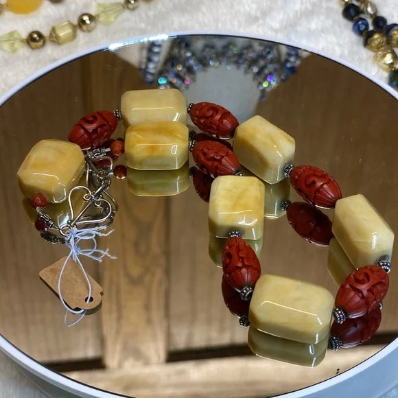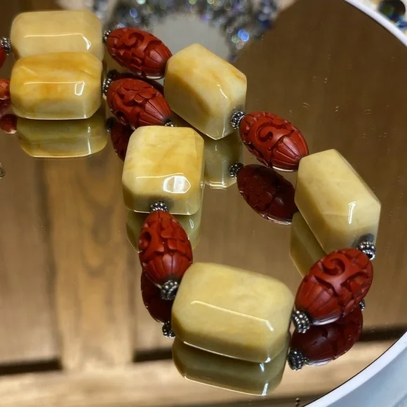 Vintage Chinese Jade and Cinnabar on Sterling Silver 16” Necklace.EUC1”X3/4” blocks of Yellow Jade 1/2 inch thick and 1” cinnabar beads.Necklace is 16” long on Sterling silver in amazing condition.Very heavy and very cold to the touch.Very good used condition