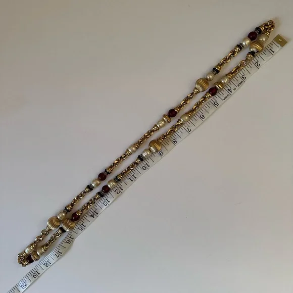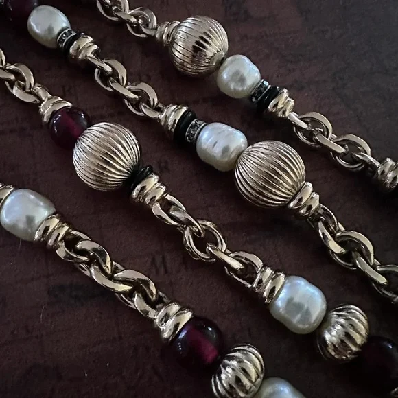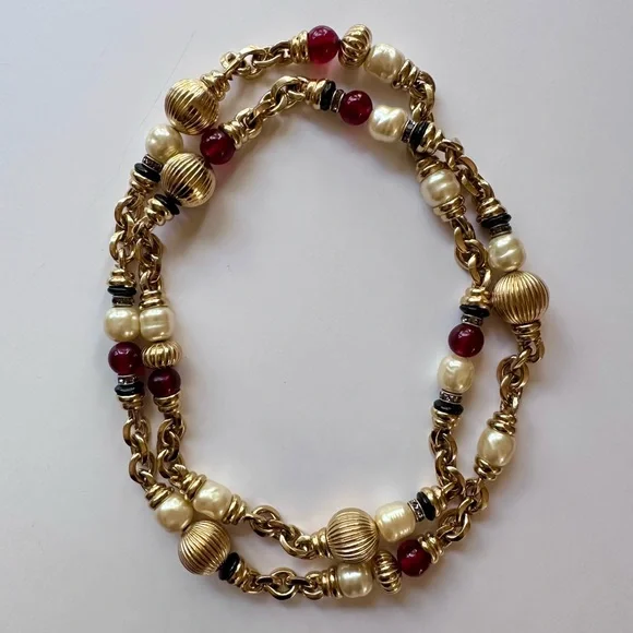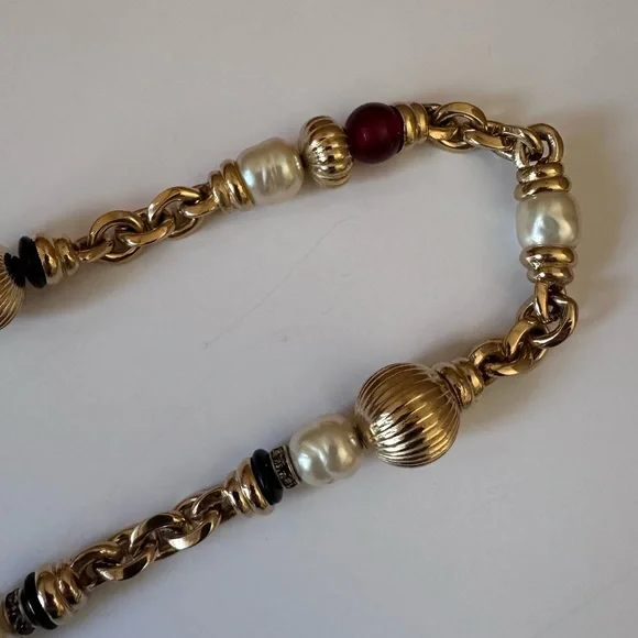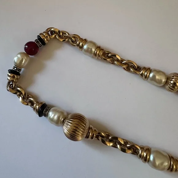 Vintage unsigned Ciner infinity-style necklace with poured glass style beads, faux pearls, rhinestone rondelles, and rich gold-plated metal work. I have seen this necklace...