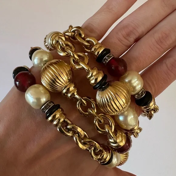 Vintage unsigned Ciner infinity-style necklace with poured glass style beads, faux pearls, rhinestone rondelles, and rich gold-plated metal work. I have seen this necklace attributed to Maison Gripoix before (sometimes for ), and while the glass beads, rhinestone rondelles, and faux pearls are similar to pieces from those lines - the metal work signifies this is Ciner. I’ve also seen this attributed to Ciner’s Jewels of India collection, but I’m not yet certain myself which of their collections it’s from. Gorgeous necklace in beautiful vintage condition. See photos for details.