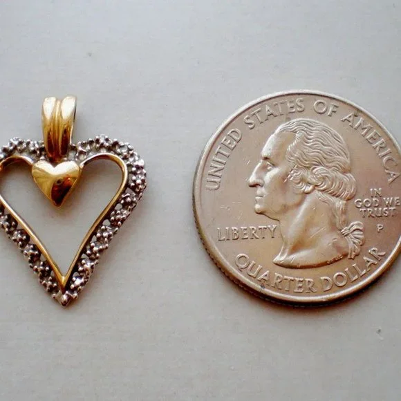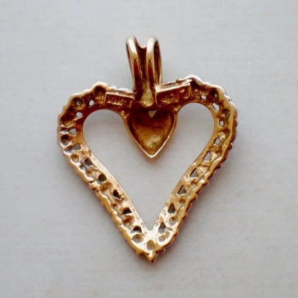 Sign up forusing my code TRAVELINGFROG to get $10 off your first purchase!Beautiful Vintage solid 10K Two Tone Yellow White Gold (marked "10K 417" and acid tested) Heart Flower Pendant Charm. It is about 15/16" in length (with bail) by about 3/4" in its widest and weighs 1.5 grams. Pendant Charm is in great vintage pre-owned condition.