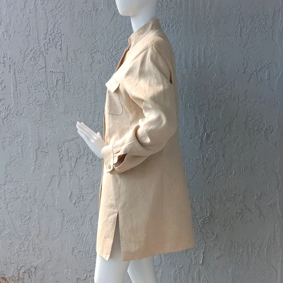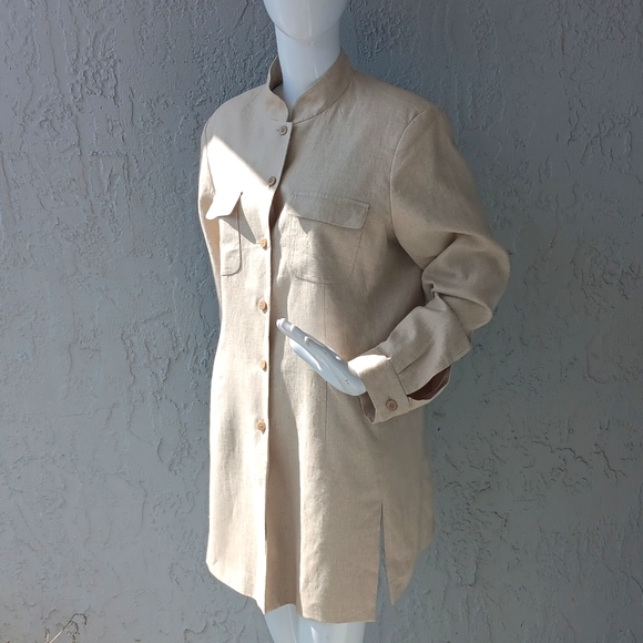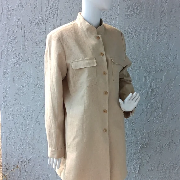 Beautifully Designed Pure Linen Classic Liz Claiborne Clergy CollarFully Lined(2) Flapped Chest Pockets (6) Button ClosureLiz Claiborne, in full Anne Elisabeth Jane Claiborne, (born March 31, 1929, Brussels, Belgium—died June 26, 2007, New York, New York, U.S.), an American fashion designer who revolutionized the women’s apparel industry in the U.S. as the head designer and co-founder (with her husband, Arthur Ortenberg, and partners, Leonard Boxer and Jerome Chazen) in 1976 of the company that bears her name. At a time when career women were looking for an alternative to suits, her line of casual, comfortable, and colorful sportswear separates allowed customers to mix and match elements of their wardrobes (jackets, pants, skirts, sweaters, and blouses). Claiborne offered her collection at realistic prices, and her company executives persuaded retailers to merchandise all the related pieces of a collection together. Her designs were meant to be more functional than trendsetting.In 1986 the sales of Liz Claiborne, Inc., reached $5.6 million, and the firm broke into the Fortune 500 list of the largest industrial companies in the U.S., the first on that list to be headed by a woman. The following year Claiborne was elected chairman of the board and CEO, but in 1989 she and her husband retired from active management in the fashion concern. Thereafter Claiborne stayed busy initiating environmental conservation projects handled by the charitable foundation she started.
