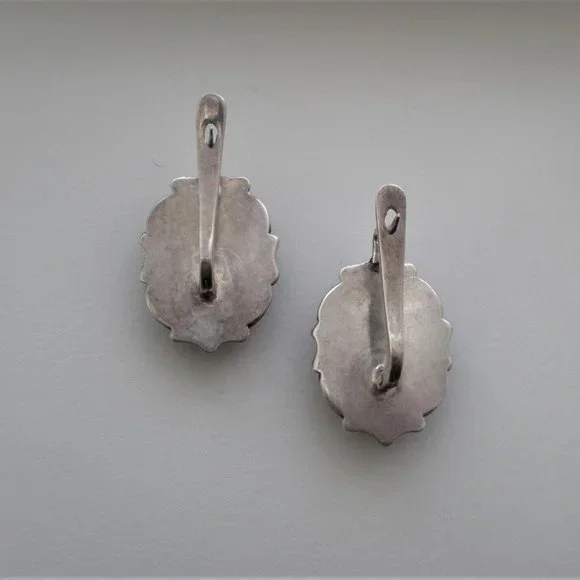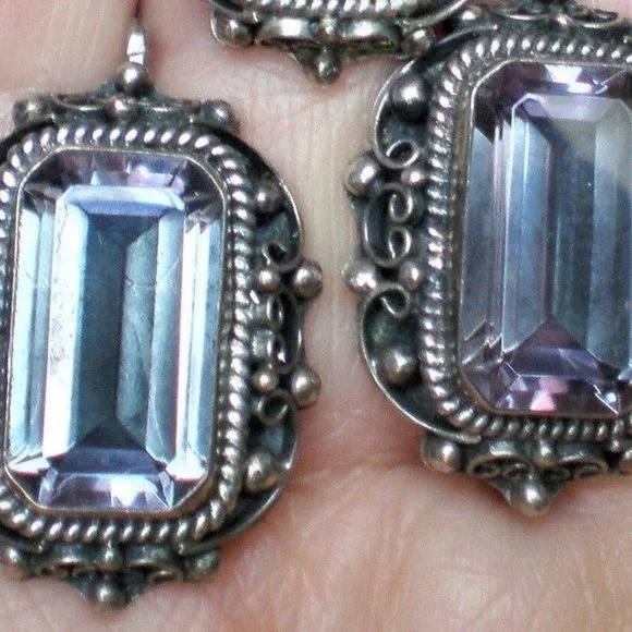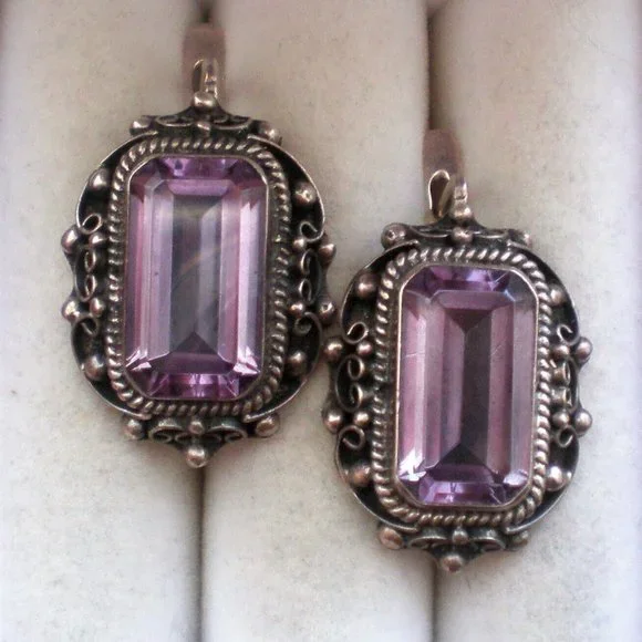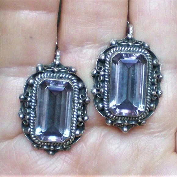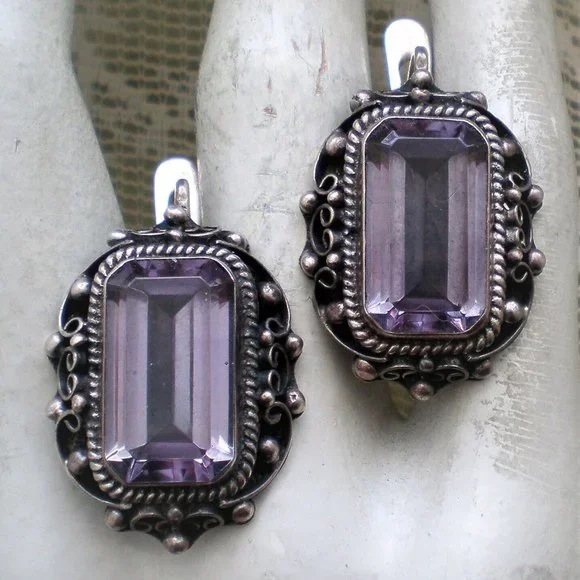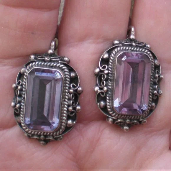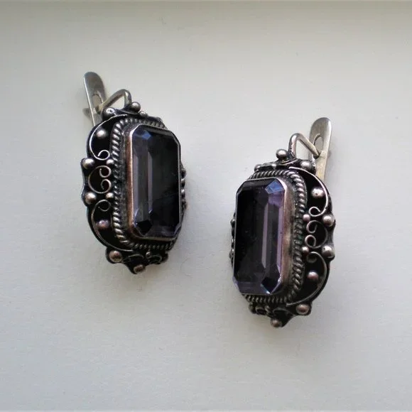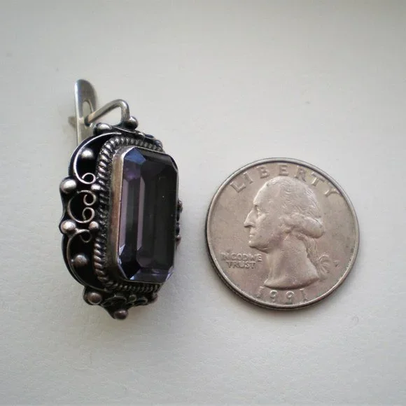 Sign up forusing my code TRAVELINGFROG to get $10 off your first purchase!Gorgeous LARGE Vintage Russian Russia Soviet USSR Handmade Custom Made Sterling Silver Large Created Alexandrite Filigree Dangle Pierced Earrings with secure Russian Lock (unmarked but and acid tested). They measure about 1 1/4" in length with post part by about 13/16" in their widest, bezel set large Created Alexandrite stones are about 18mm by 10mm each and change color from purple to teal green. These unique earrings weigh about 19.6 grams and are in great vintage used pre-owned condition.
