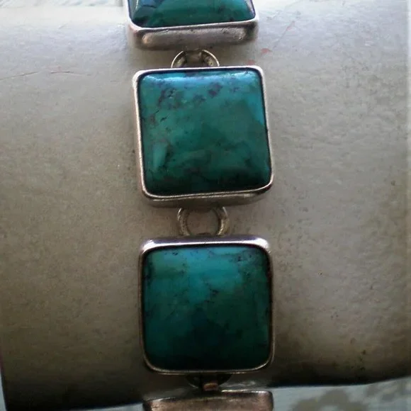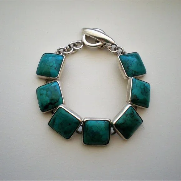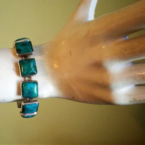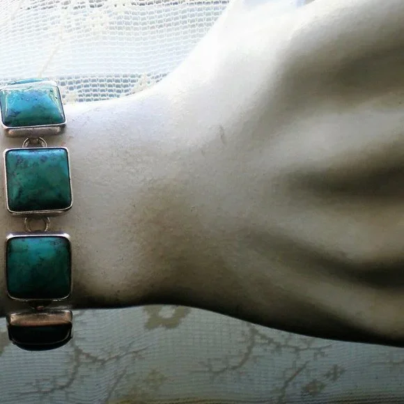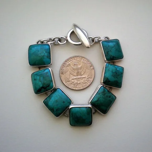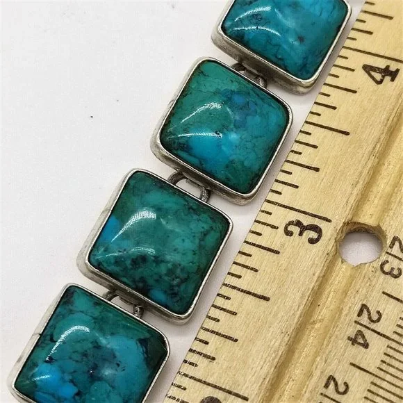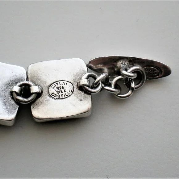 Sign up forusing my code TRAVELINGFROG to get $10 off your first purchase!Gorgeous Heavy Mexico Mexican Taxco Designer Citlal Castillo solid Sterling Silver 925 Bezel Set Genuine Turquoise Tennis Bracelet approximately 43 grams (marked "Citlal Castillo .925 Mex" and acid tested). It is in great vintage used pre-owned condition, is about 6.75"-7" in length (with clasp)and about 5/8" in its widest. Turquoise stones are about 14.5mm by 14.5mm.