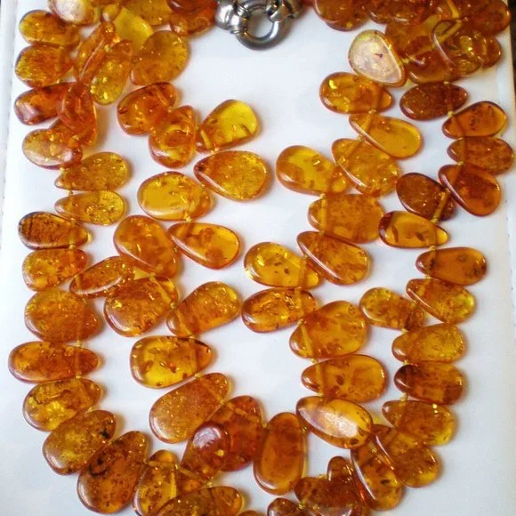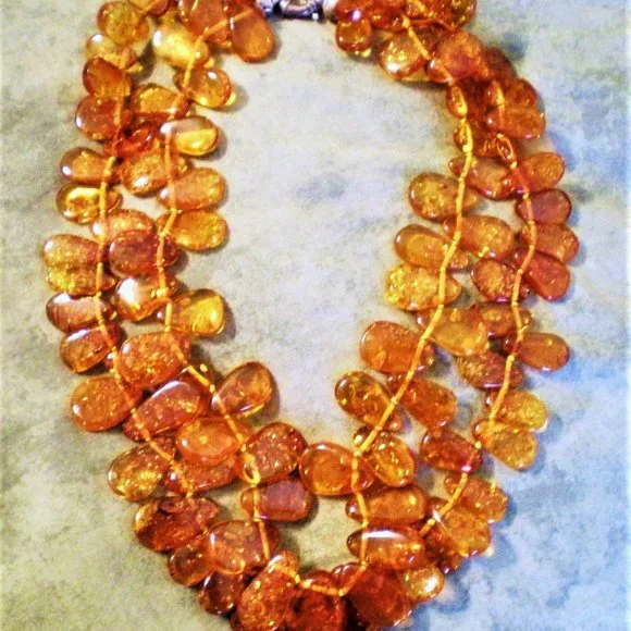 Sign up forusing my code TRAVELINGFROG to get $10 off your first purchase!GORGEOUS Vintage genuine Baltic Honey Amber solid Sterling Silver 925 Clasp 2 Strand Beaded NECKLACE COLLIER. Baltic Amber Strands vary from about 17.5" in length (with clasp) to about 19.5" in length (with clasp). Amber pieces vary in size from about 17mm by 10mm to about 23mm by 15mm. Necklace weighs about 86.2 grams and is in great MINT vintage pre-owned condition.