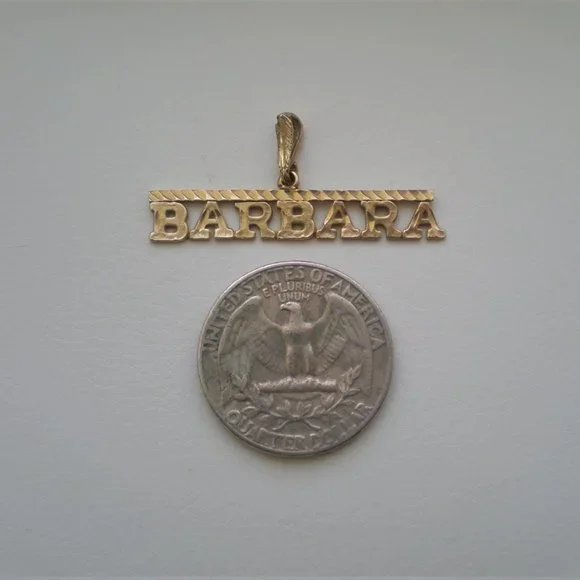 Sign up forusing my code TRAVELINGFROG to get $10 off your first purchase!Beautiful Vintage solid 14K Yellow Gold BARBARA Name Pendant Charm about 1.7 grams (unmarked but acid tested). It is in great vintage used pre-owned condition and measures about 5/8" in length (with bail) by about 1 7/16" in its widest.