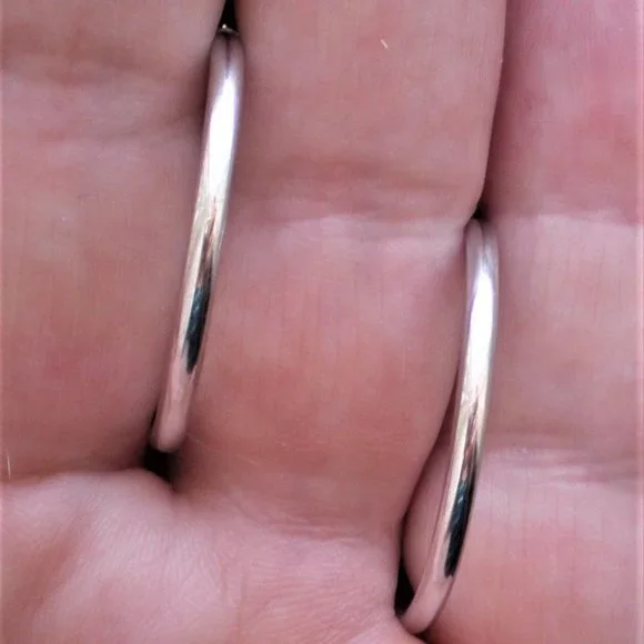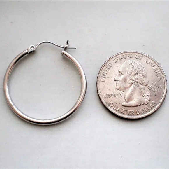 Sign up forusing my code TRAVELINGFROG to get $10 off your first purchase!Beautiful Vintage solid 14K White Gold Hollow Hoop Pierced Earrings about 2.2 grams (marked "14K" and acid tested). They are in great vintage pre-owned condition and measure about 1 1/8" in length (with post part), about 1 1/16" in diameter and about 2mm in width.