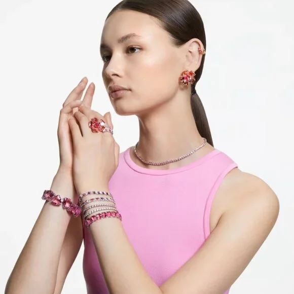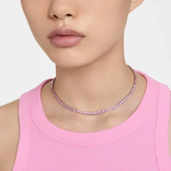 New in original box and packaging. Purchased from Swarovski store.Matrix Tennis necklace MediumRound cut, Pink, Rhodium platedLength (minimum - maximum): 16 1/8 - 16 1/8 inchWidth: 1/8 inchMaterial:Rhodium plated, ZirconiaColor:Pink