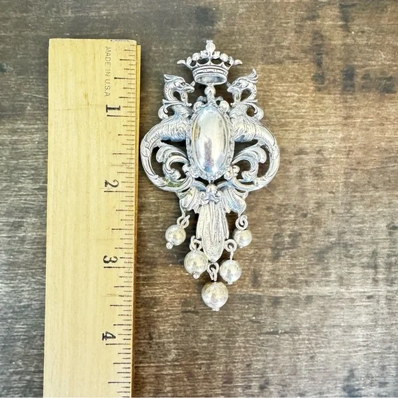 Cini Sterling Silver Brooch, Art Nouveau Griffen Dragon & Crown Dangle Pendant