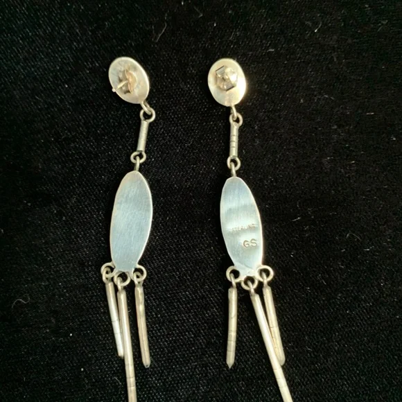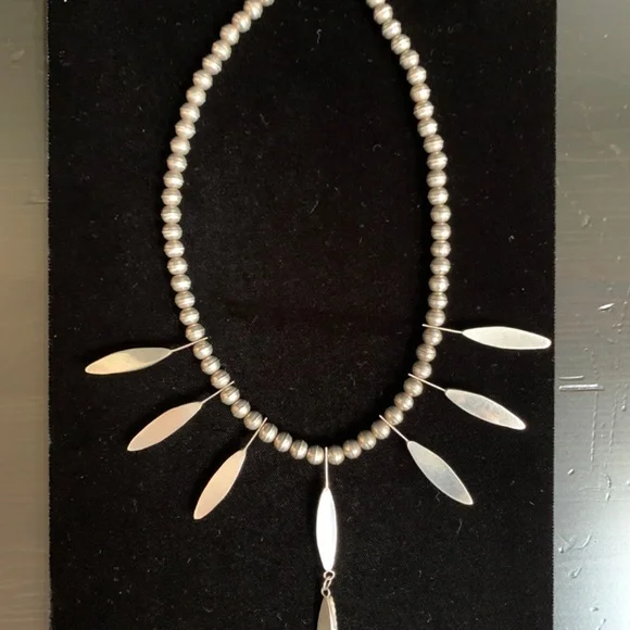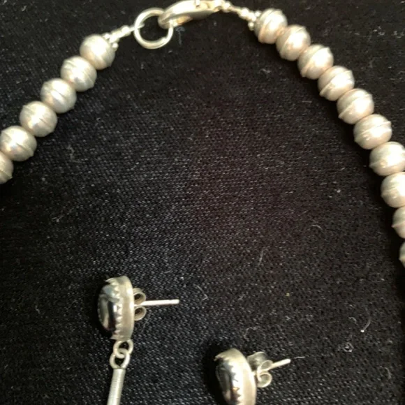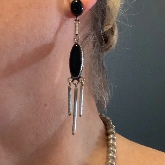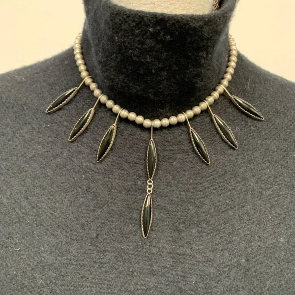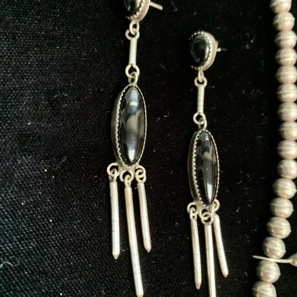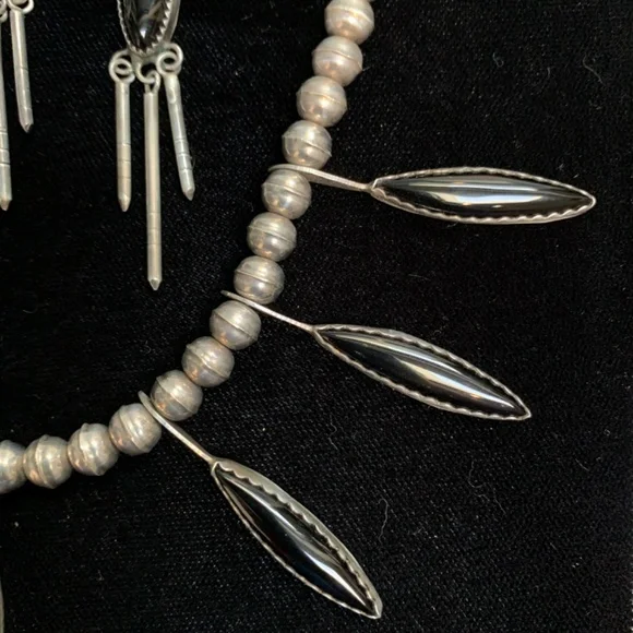 Sterling Silver beaded necklace with eight Marquise drop black onyx inlay links and matching sterling silver dangling earrings. Artist unknown. My husband bought these for me on our trip to Santa Fe probably 35 years ago.(Before kids) This is a beautiful piece of jewelry and really stands out with the right outfit. I haven’t worn it in many, many years. Time for someone else to enjoy them!The necklace is 18” long with clasps. Each marquise is about 2”. They each have their own number etched on the back.54, 22, 96, 11, 52, 13, 37, 94.