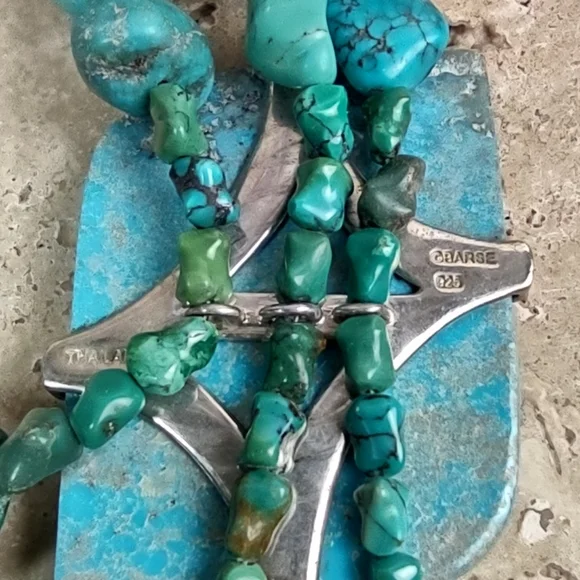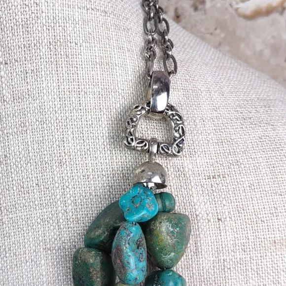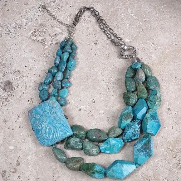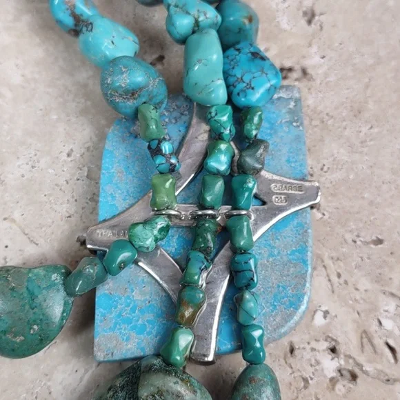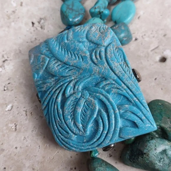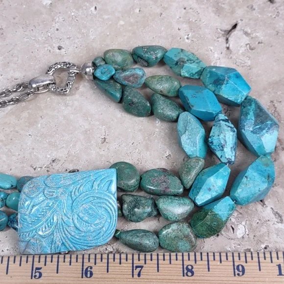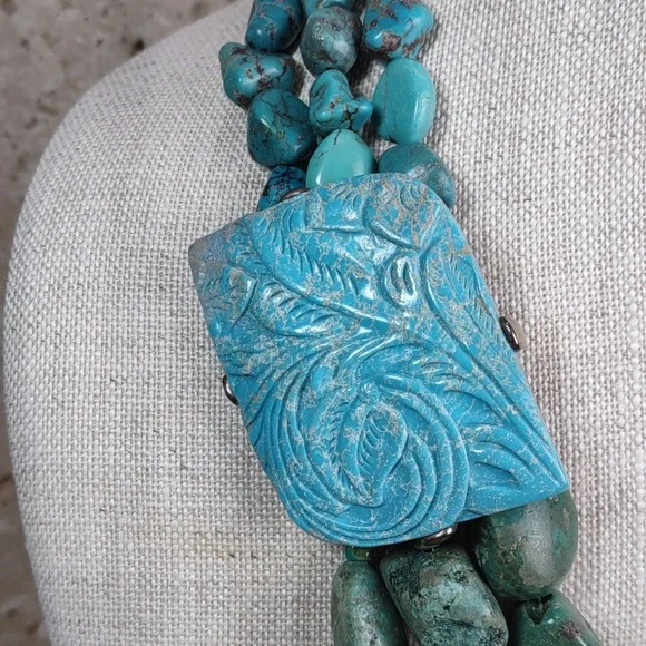 Barse turquoise and sterling silver statement necklace.Fabulous chunky multi strand layered turquoise necklace features a hand carved turquoise slab.Measures 19" length with a...