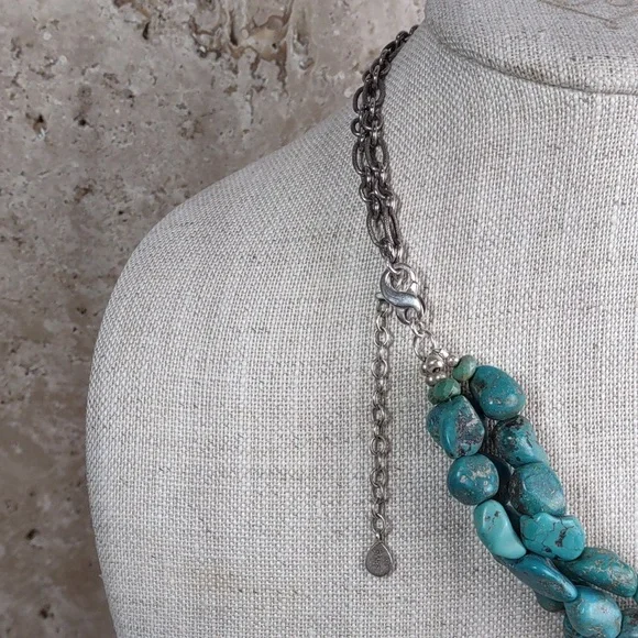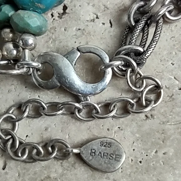 Barse turquoise and sterling silver statement necklace.Fabulous chunky multi strand layered turquoise necklace features a hand carved turquoise slab.Measures 19" length with a lobster claw clasp and a 2" chain link extender finished with a little logo charm.Stamped 925 BARSEPre-owned, excellent condition.