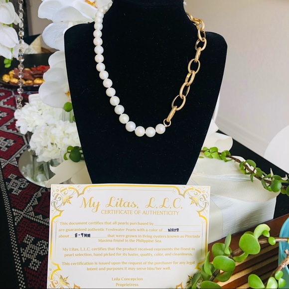 8-9 mm white freshwater pearls mixed with gold-plated stainless steel, individually knotted to secure each one. Unique piece of conversation. Pearls with hardly visible flaws, as...
