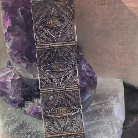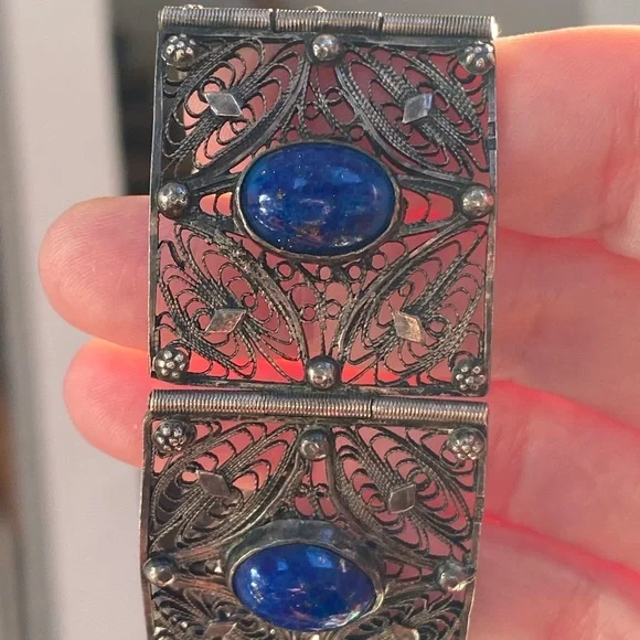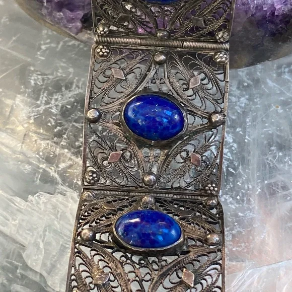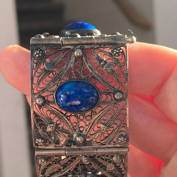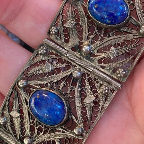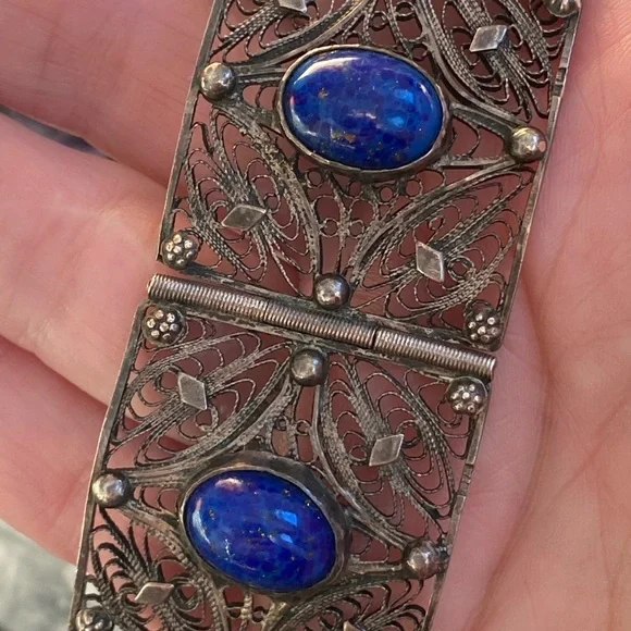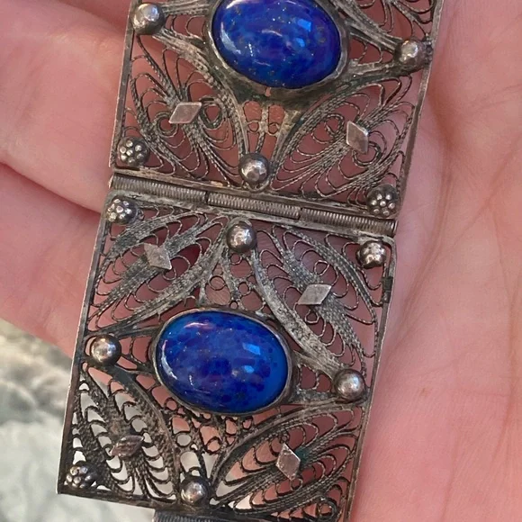 Very old vintage panel lapis sterling filagree bracelet. The stones on here are beautiful! Stunning piece . No defects seen just gorgeousness . Each stone gorgeous with specs of...