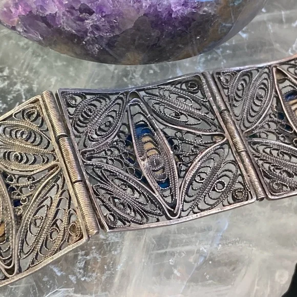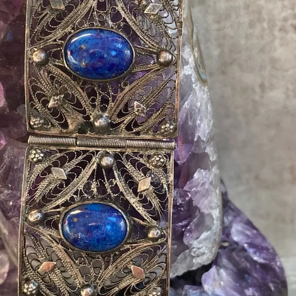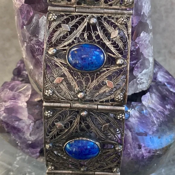 Very old vintage panel lapis sterling filagree bracelet. The stones on here are beautiful! Stunning piece . No defects seen just gorgeousness . Each stone gorgeous with specs of pyrite through the lapis . This is amazing .. measuring 7 inch wearable . Rod closure