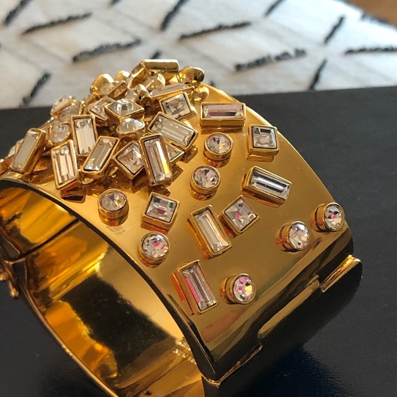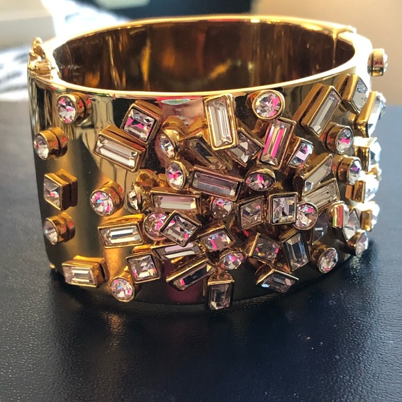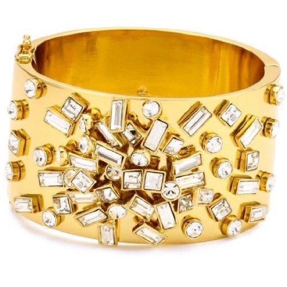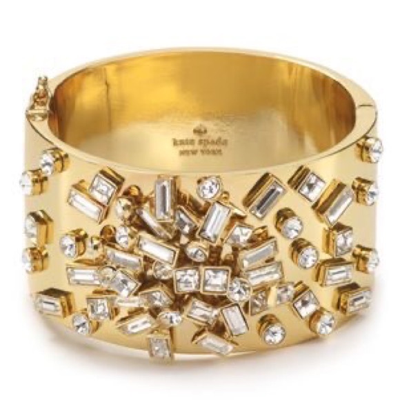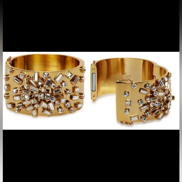 Beautiful wide Kate spade cuff/bangle kaleidoball encrusted hinge bangleThis gleaming gold-plated cuff with clustered crystals.12-karat yellow gold plate.Multi-cut crystals cluster on front.Magnetic closure with small hinged secures.7" inside circumference.