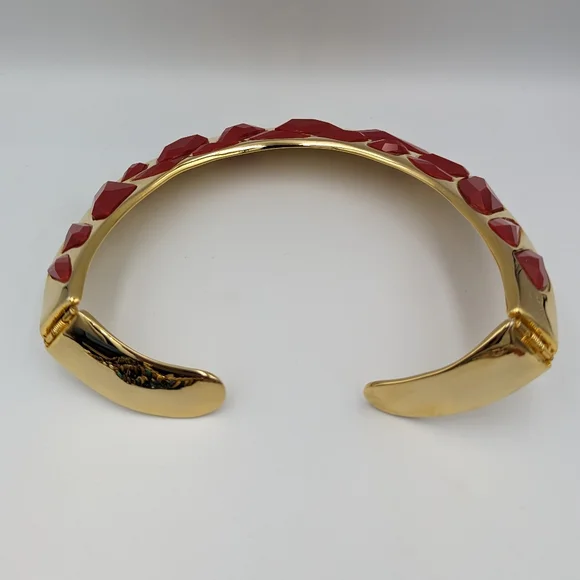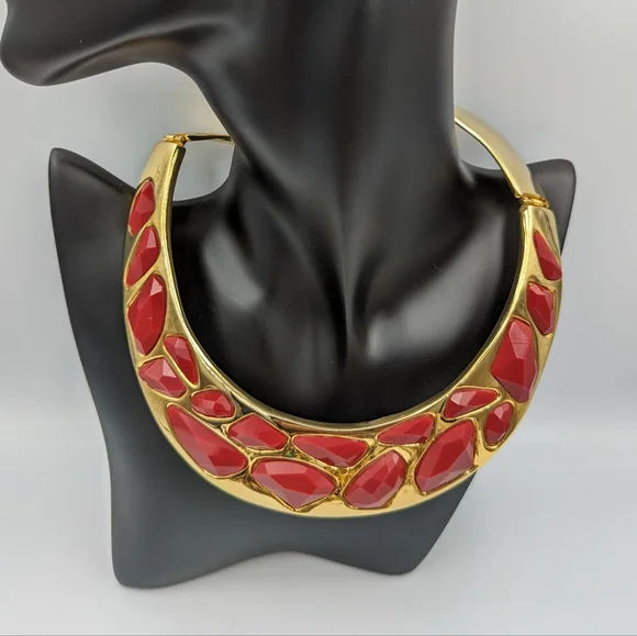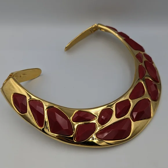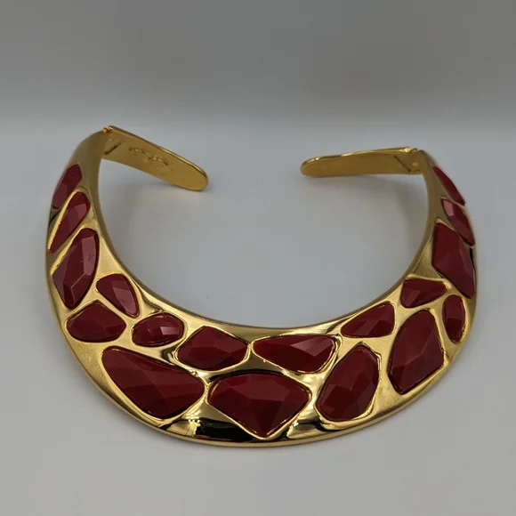Kenneth Jay Lane (KJL) gold tone hinged bib collar necklace with jet rad faceted stones in irregular shapes and sizes. Signed Kenneth Lane, Made in USA.From Kenneth Jay...