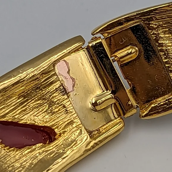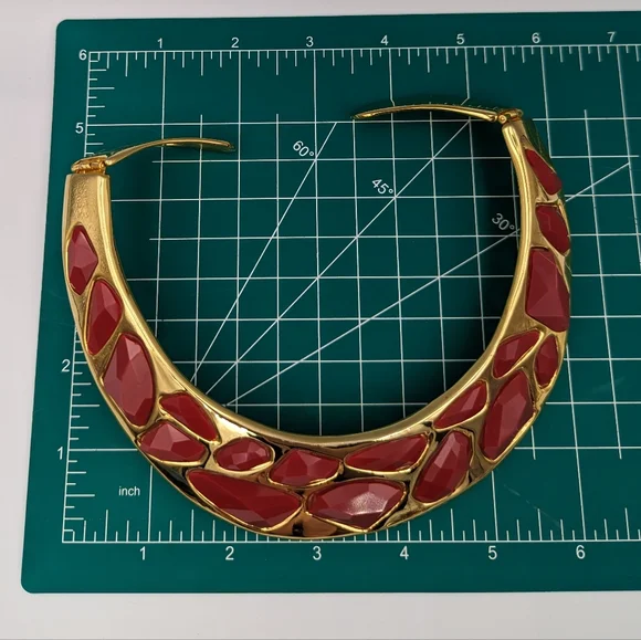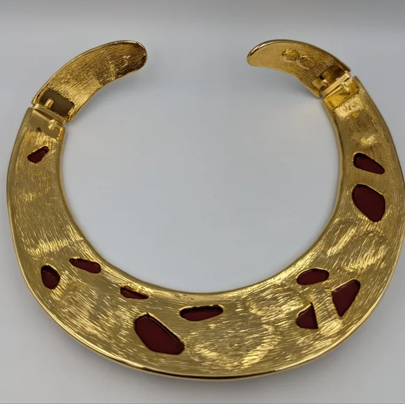 Kenneth Jay Lane KJL gold tone hinged bib collar necklace & jet red stones USA