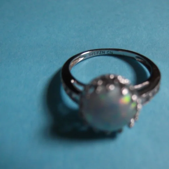 Beautiful White Opal with White Sapphires Ring.New without tags.This ring is classy and understated.This elegant opal catches the light and the colors show amazingly!!Rohodium-plated sterling silver ring with opal with white sapphires.The Opal is approximately 8 mm, round cut in a prong setting. So beautiful.
