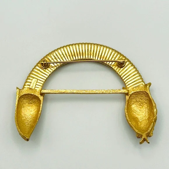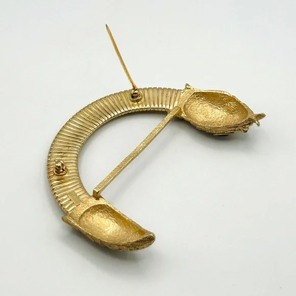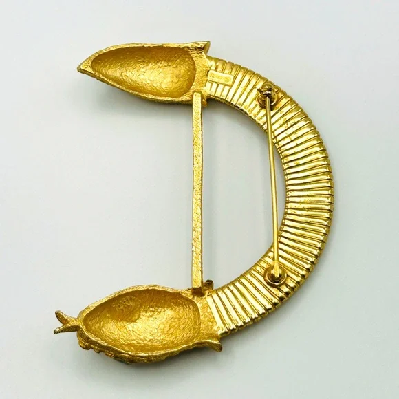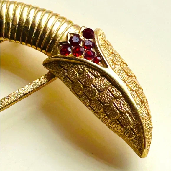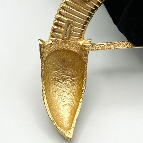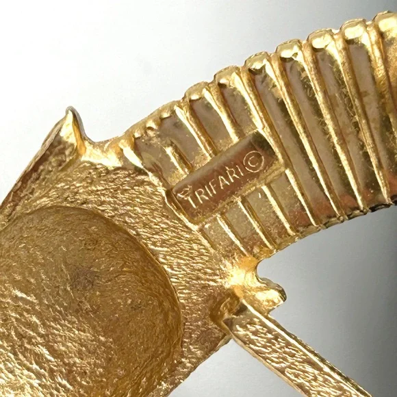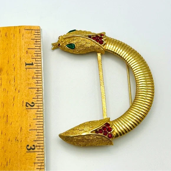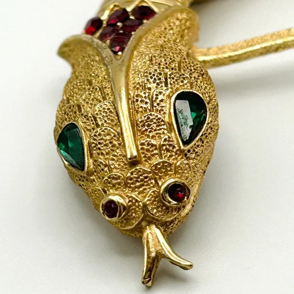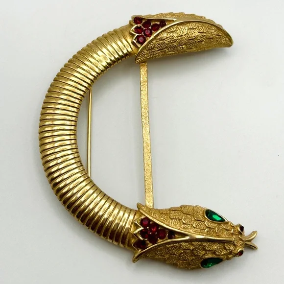 This stunning and hard-to-find Trifari brooch is part of the iconic “Jewel of India” Moghul collection, designed in the 1950s by Alfred Philippe. It features the signature Trifari snake motif—elegantly coiled and richly adorned with faux Gripoix poured glass cabochons and rhinestones in regal jewel tones. Marked Trifari with the crown stamp on the reverse.The design evokes the opulence of Indian royal treasures, and this particular piece is an extraordinary collector’s item—especially rare in brooch form. In vintage condition with slight wear on the back, consistent with age, but all stones are intact and the pin back functions well.✨ Signed Crown Trifari✨ From the legendary “Jewel of India” collection✨ Designed by Alfred Philippe✨ Faux Gripoix poured glass cabochons✨ Snake motif — a rare and desirable figural design✨ Approx. 3”✨ From a smoke-free home✨ From aGold Ambassador with hundreds of 5-star reviews - Buy with confidence!Don’t miss your chance to own a piece of Trifari history. This brooch is truly museum-worthy.