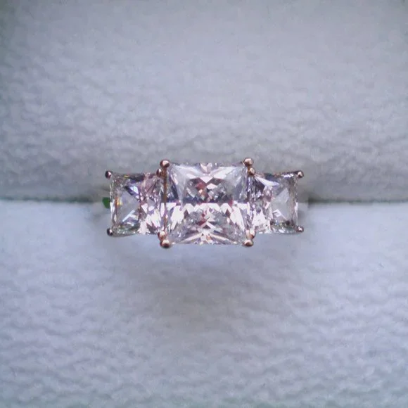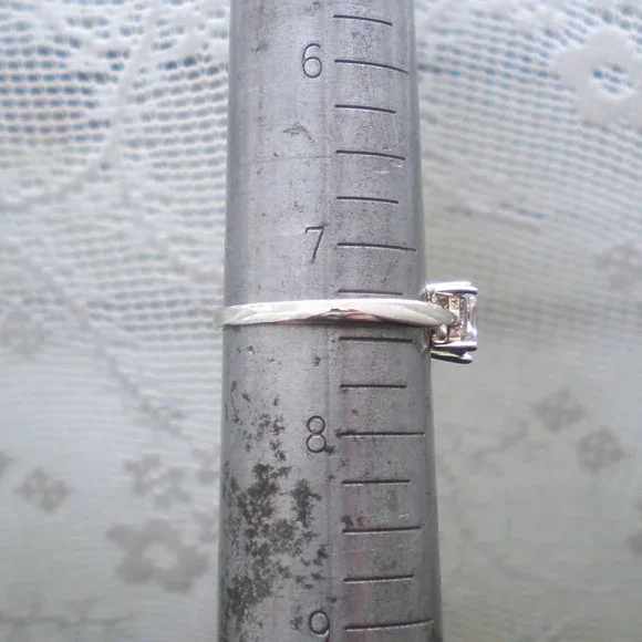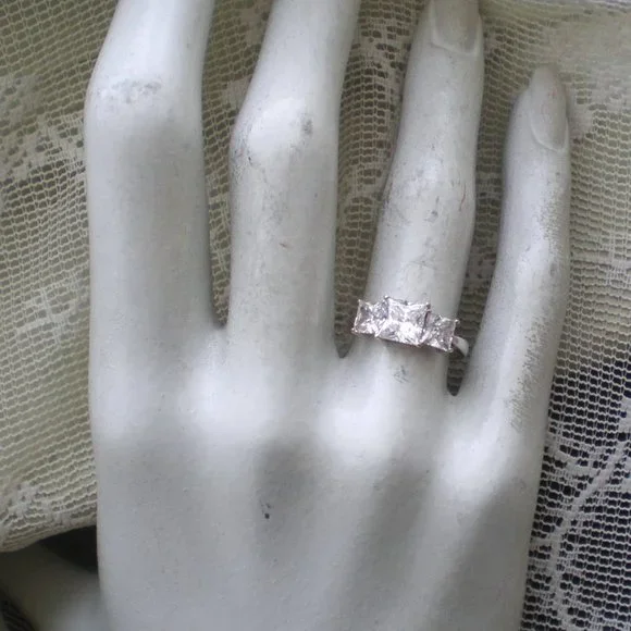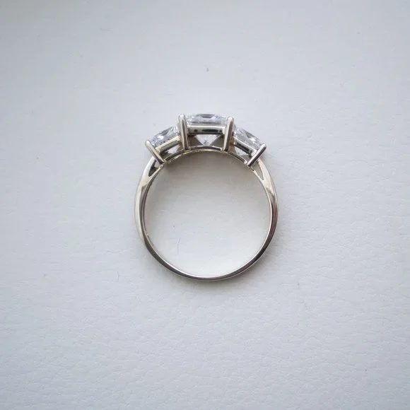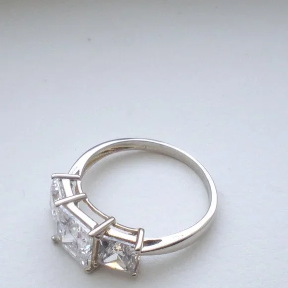 Sign up forusing my code TRAVELINGFROG to get $10 off your first purchase!Beautiful solid 14K White Gold 3CT Princess Cut CZ Wedding Anniversary RING about size 7.25-7.5 (marked "14K" and acid tested). Ring weighs about 2.9 grams. Top of the ring is about 7mm in its widest, bottom is about 2mm in width. 3 CZ vary in size from about 5mm x 5mm (side stones) to about 6.5mm x 6.5mm (center stone) or approximately 3CT total weight. Ring is in great used pre-owned condition.