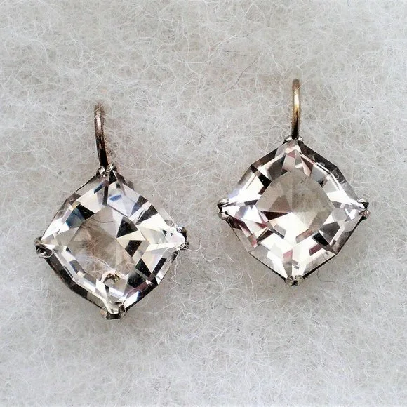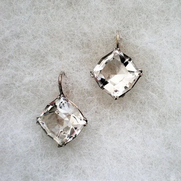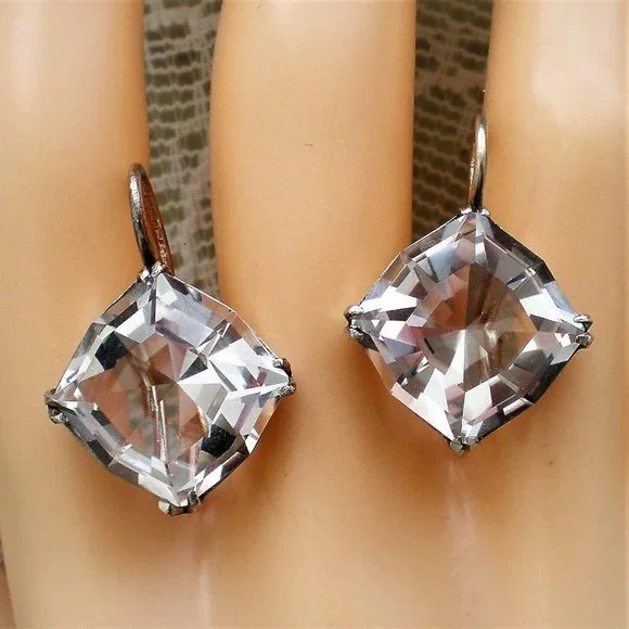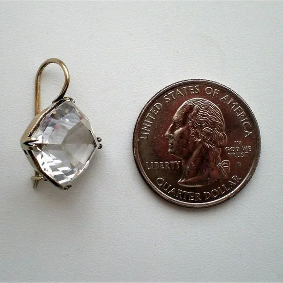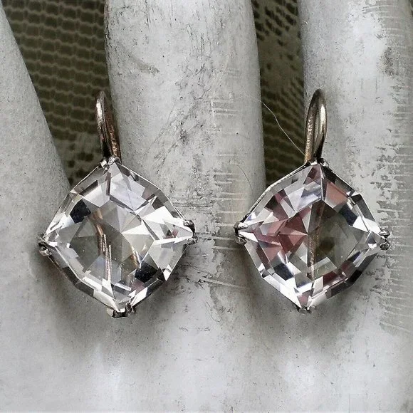Sign up forusing my code TRAVELINGFROG to get $10 off your first purchase!Gorgeous Vintage Russian Russia Soviet USSR solid Silver 875 Genuine Russian 15MM X 15MM Faceted Rock Crystal Solitaire Drop Dangle Earrings (marked on hooks "875 with star, hammer and sickle" and acid tested). Earrings measure about 15/16" in length (with hook part) and about 16mm in their widest. Genuine Russian Faceted Rock Crystal is about 15mm X 15mm. These unique earrings weigh about 5.7 grams and are in vintage pre-owned condition.