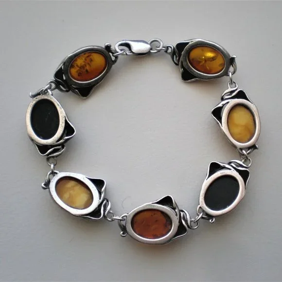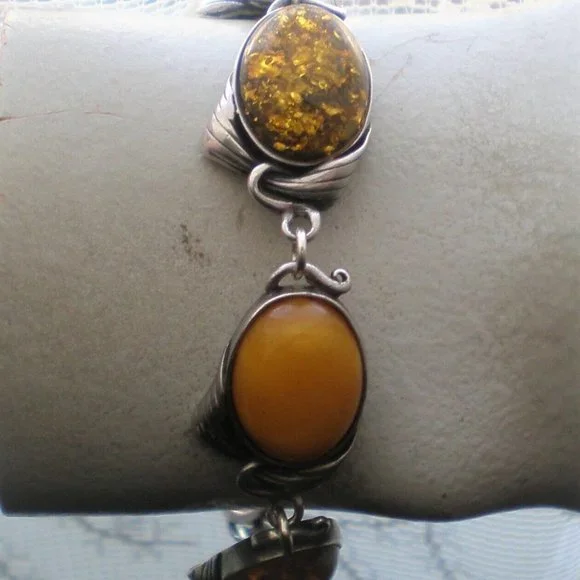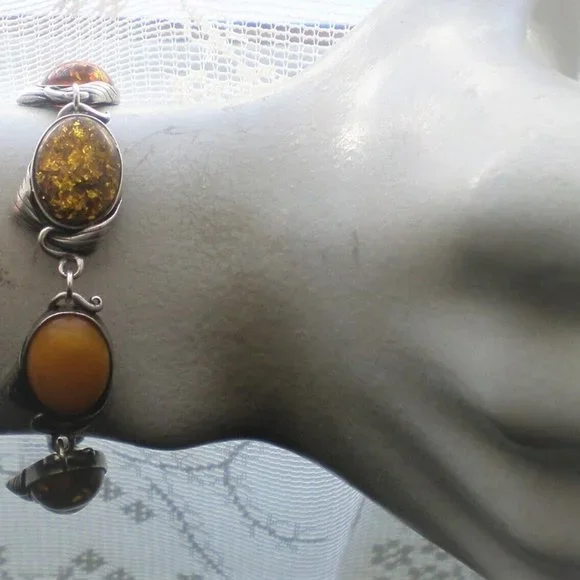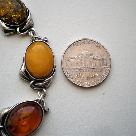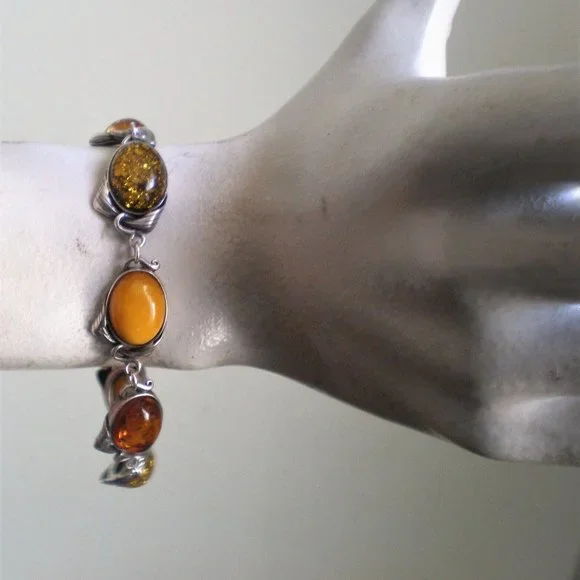 Sign up forusing my code TRAVELINGFROG to get $10 off your first purchase!GORGEOUS Vintage solid Sterling Silver 925 Genuine Natural Multi Color Russian Baltic Butterscotch Egg Yolk, Honey and Green Amber BRACELET (marked on clasp "925" and acid tested). It weighs approximately 21.3 grams and is in great vintage used pre-owned condition.It is about 8 3/8" in length (with clasp) and about 16mm in its widest. Genuine Natural Russian Baltic Amber stones are about 16mm by 12mm.