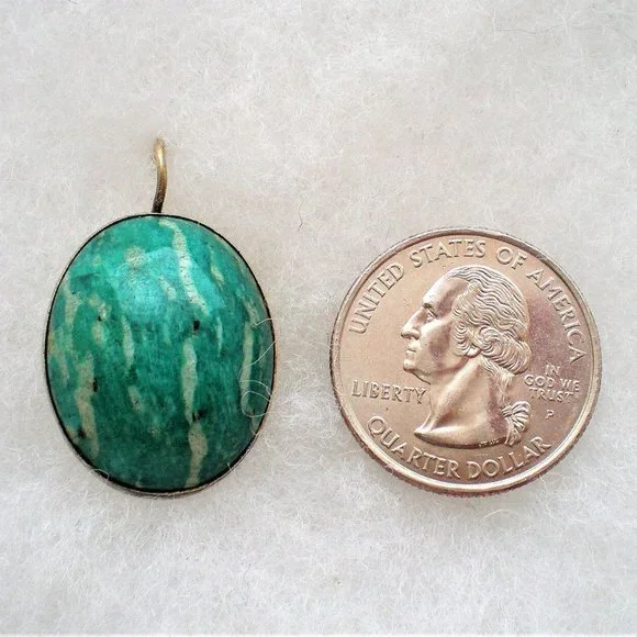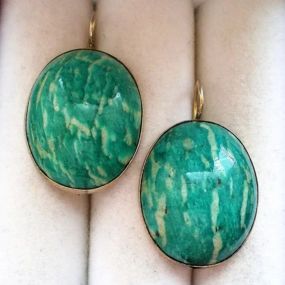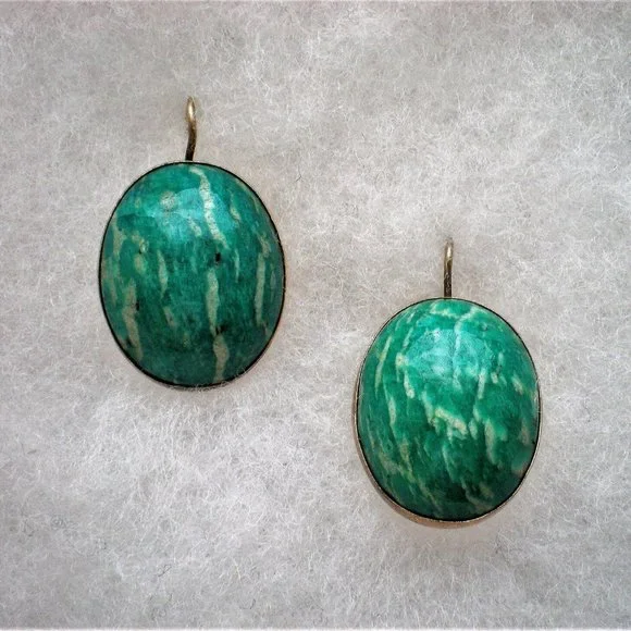 Sign up forusing my code TRAVELINGFROG to get $10 off your first purchase!Gorgeous Antique Vintage LARGE Russian Russia Soviet USSR solid Gold Gilded Silver 875 bezel set genuine natural Russian Green Amazonite Dangle Pierced Earrings (marked "875 with star, hammer and sickle" and acid tested). They measure about 1 5/16" in length with hook part by about 13/16" in their widest, bezel set genuine Amazonite stones are about 24mm by 19mm each. These unique earrings weigh approximately 15.7 grams and are in great antique vintage pre-owned condition.