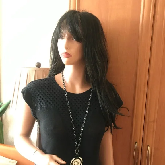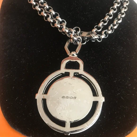 This striking Givenchy necklace features a bold black and white geometric pendant, framed in charcoal silver-tone metal, hanging from a long chain design that could be converted to choker. In good used condition. I have a matching bracelet in my closet. Bundle and save!