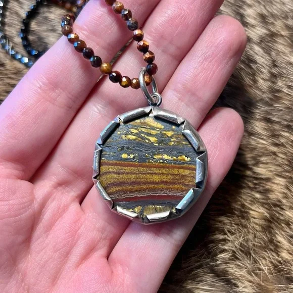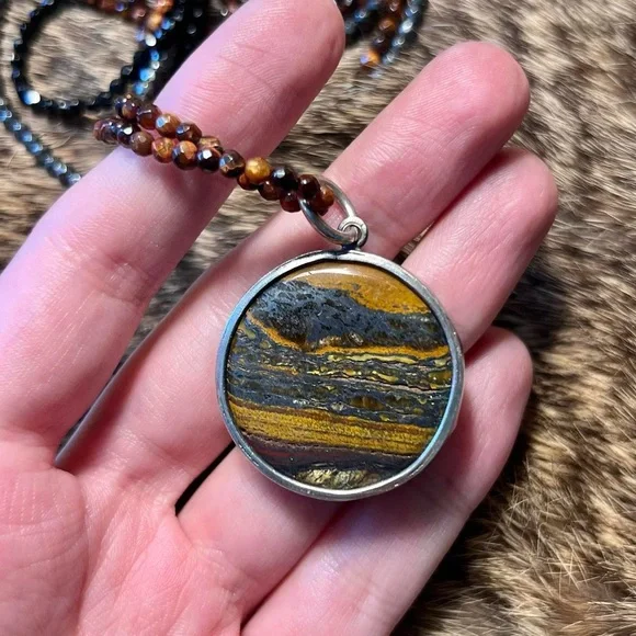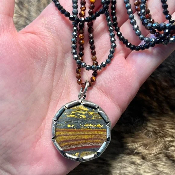 Rare sterling silver Chan Luu tiger iron three strand beaded necklace. Super unique, discontinued piece by designer Chan Luu. Three strands of sparkly faceted stone beads - one of grey metallic hematite, pure black onyx, and reflective, golden brown tigers eye (actually kind of red - really unique color for tiger’s eye) with a chunky pendant - tiger iron with an amazing banded pattern and reflective golden yellow tigers eye in a brutalist bezel frame. In great shape. Flower shaped toggle clasp. Most accurate colors are in the photos. Stamped Chan Luu 925, chain length about 17 inches, pendant 1.75 x 1.25 inches with bail, 36g.062724303881