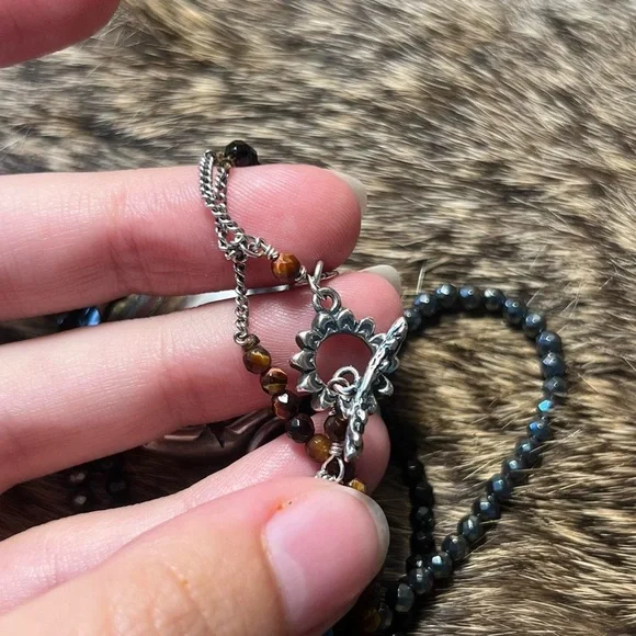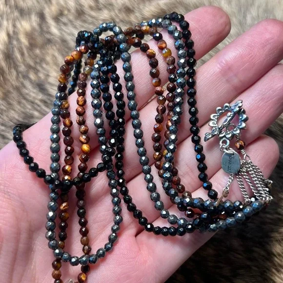 Rare sterling silver Chan Luu tiger iron three strand beaded necklace. Super unique, discontinued piece by designer Chan Luu. Three strands of sparkly faceted stone beads - one of...