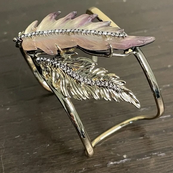 Chic bracelet with a feather motif. Features champagne and purple Lucite with delicate crystals and green stone/crystal hues. New no tags with pouch. I have matching ting and earrings in my closet. Bundle and save!