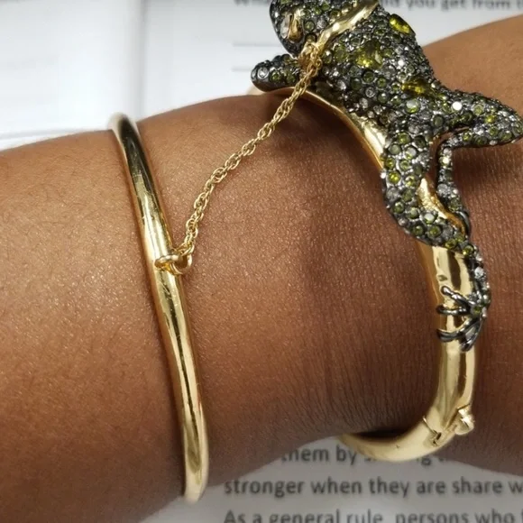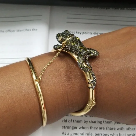 Elegant gold bracelet featuring a striking green crystal frog design. Perfect for adding a bold touch to any outfit. I have a matching choker necklace and a ring in my closet....