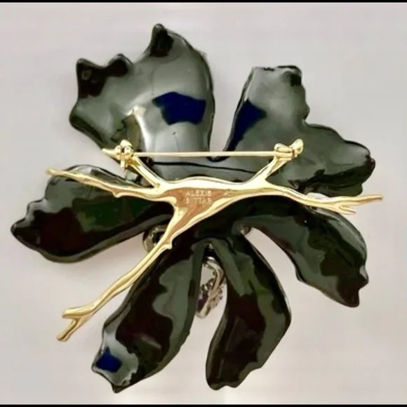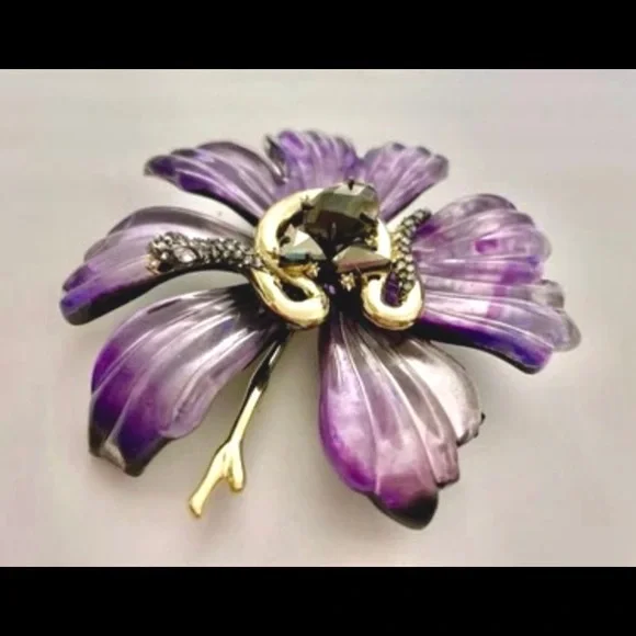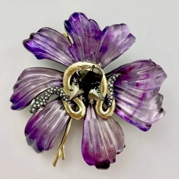 This exquisite Alexis Bittar brooch features a stunning floral design with translucent purple petals that gracefully fade to lighter shades. The center showcases intricate gold...