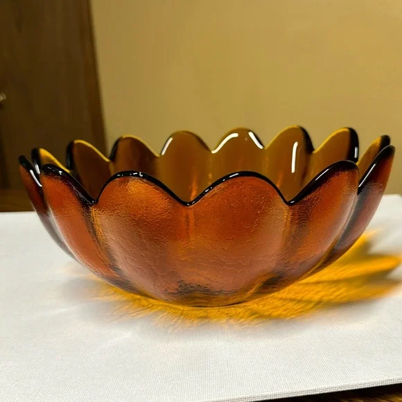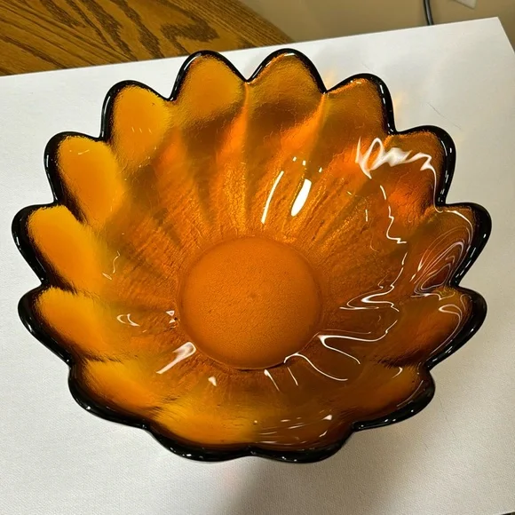 Vintage Blenko Glass Large Amber Honey 14 Petal Scalloped Lotus Bowl 10.5" diameter 4.5” tallHeavy Glass Gorgeous Bowl in a gorgeous colorNo breaks or chips (511222425)